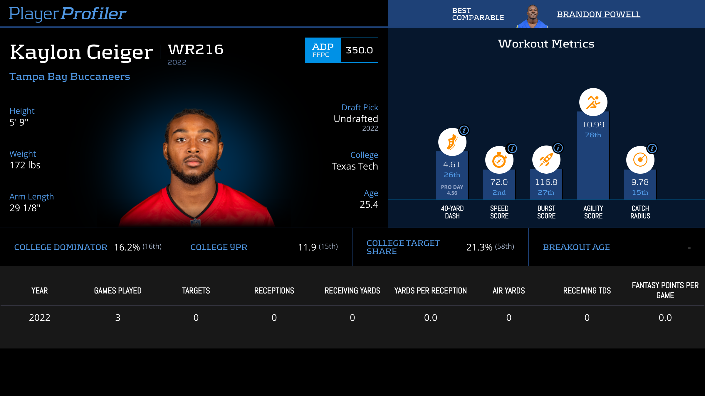 | Year Year | Games Games | Receptions Recs | Receiving Yards Rec Yds | Target Share Tgt Share | Catch Rate Catch Rate | Receiving Touchdowns Rec TDs | Special Teams Yards Special Teams | Age Age | School School |