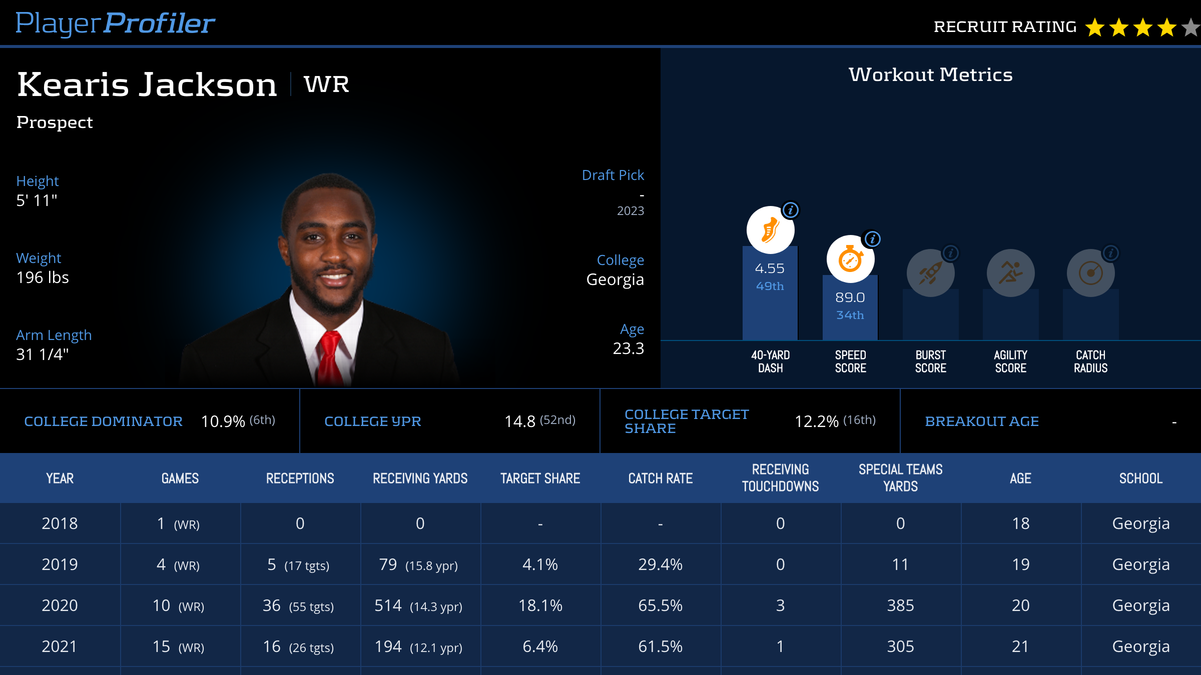 | Year Year | Games Games | Receptions Recs | Receiving Yards Rec Yds | Target Share Tgt Share | Catch Rate Catch Rate | Receiving Touchdowns Rec TDs | Special Teams Yards Special Teams | Age Age | School School |
