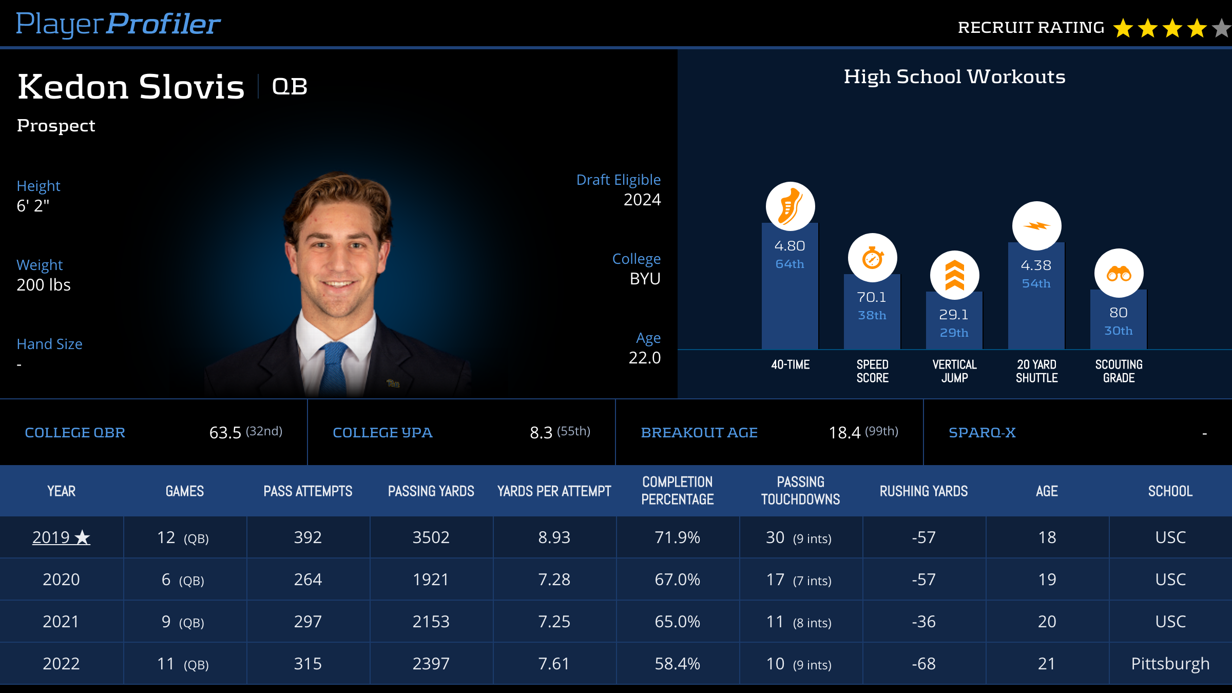 | Year Year | Games Games | Pass Attempts Pass Atts | Passing Yards Pass Yds | Yards Per Attempt YPA | Completion Percentage Comp % | Passing Touchdowns Pass TDs | Rushing Yards Rush Yds | Age Age | School School |
