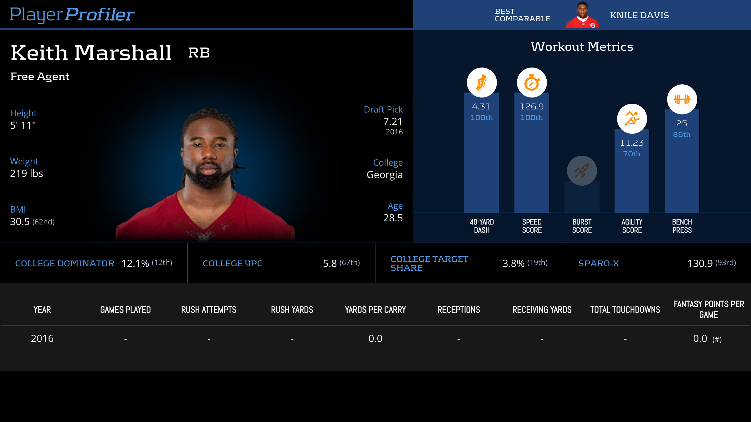 | Year Year | Games Games | Rush Attempts Rush Atts | Rushing Yards Rush Yrds | Total Touchdowns TDs | Receptions Rec | Receiving Yards Rec Yrds | Target Share Tgt Share | Age Age | School School |