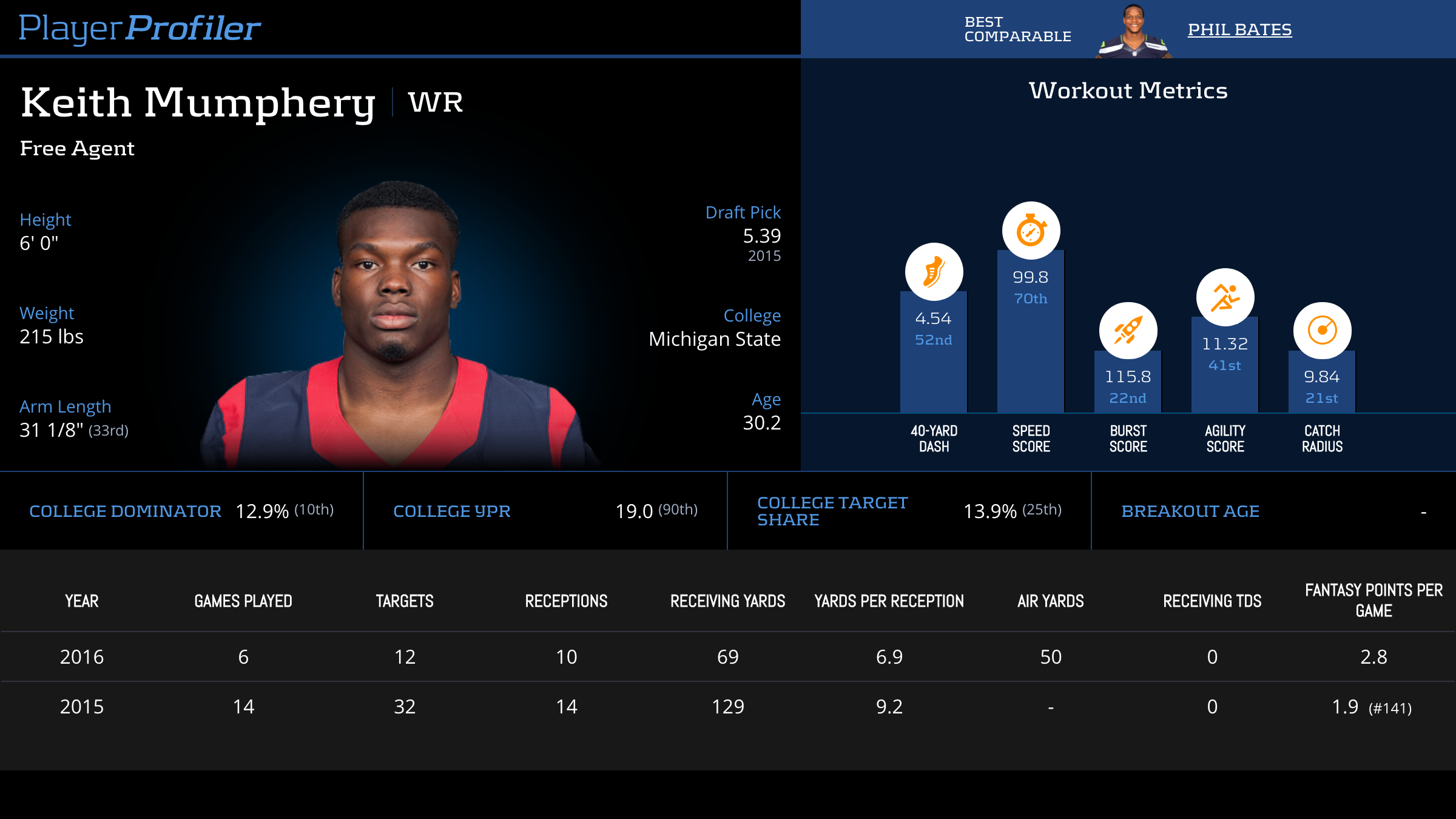 | Year Year | Games Games | Receptions Recs | Receiving Yards Rec Yds | Target Share Tgt Share | Catch Rate Catch Rate | Receiving Touchdowns Rec TDs | Special Teams Yards Special Teams | Age Age | School School |