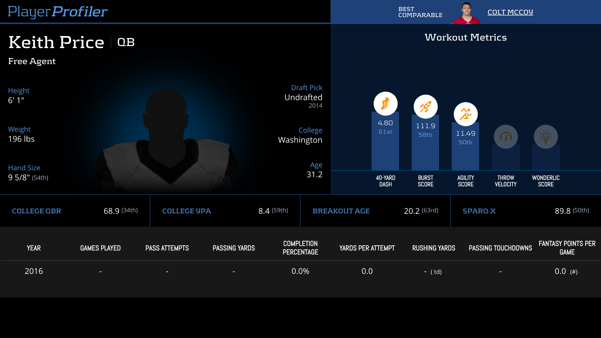 | Year Year | Games Games | Pass Attempts Pass Atts | Passing Yards Pass Yds | Yards Per Attempt YPA | Completion Percentage Comp % | Passing Touchdowns Pass TDs | Rushing Yards Rush Yds | Age Age | School School |