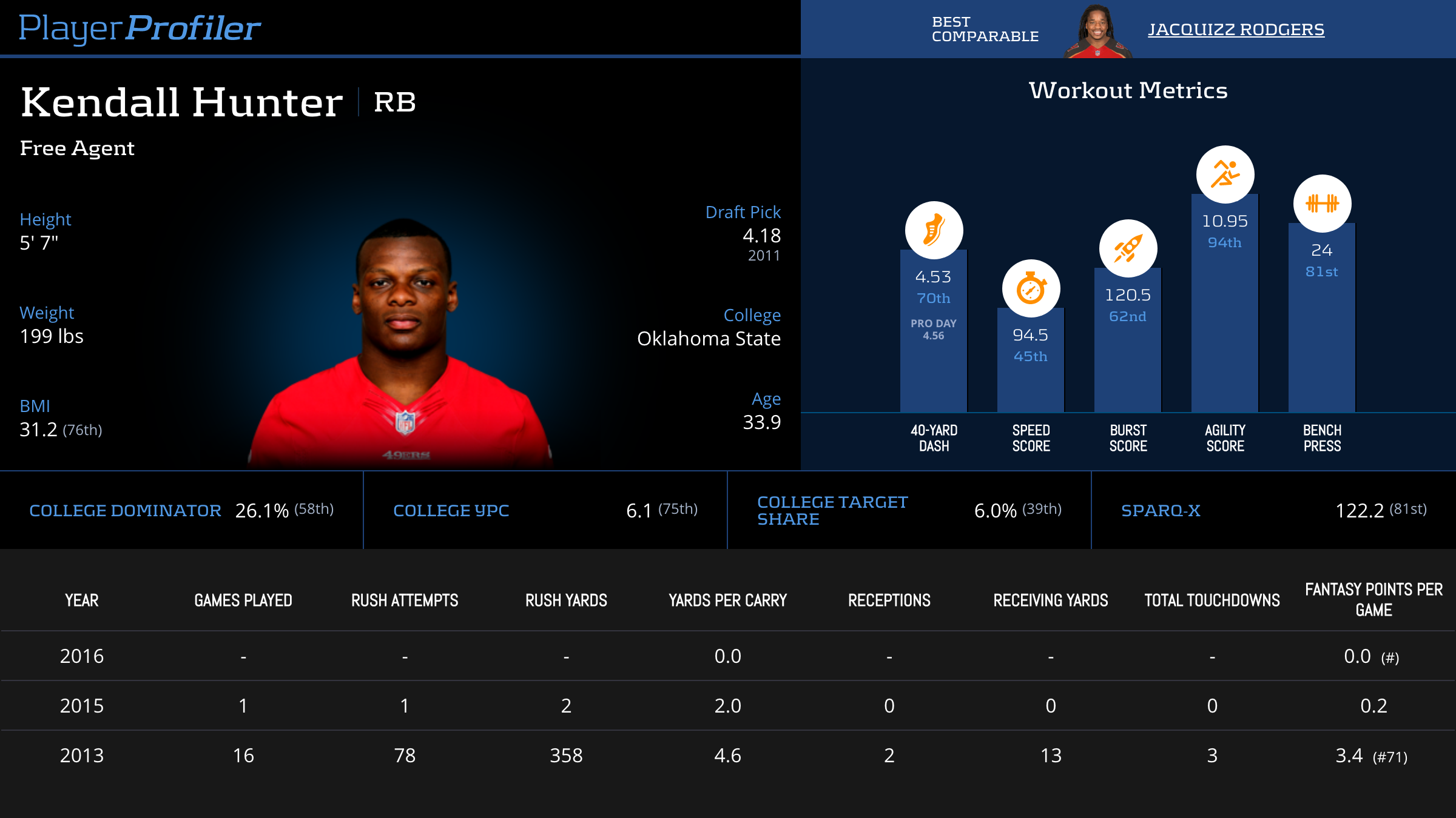 | Year Year | Games Games | Rush Attempts Rush Atts | Rushing Yards Rush Yrds | Total Touchdowns TDs | Receptions Rec | Receiving Yards Rec Yrds | Target Share Tgt Share | Age Age | School School |