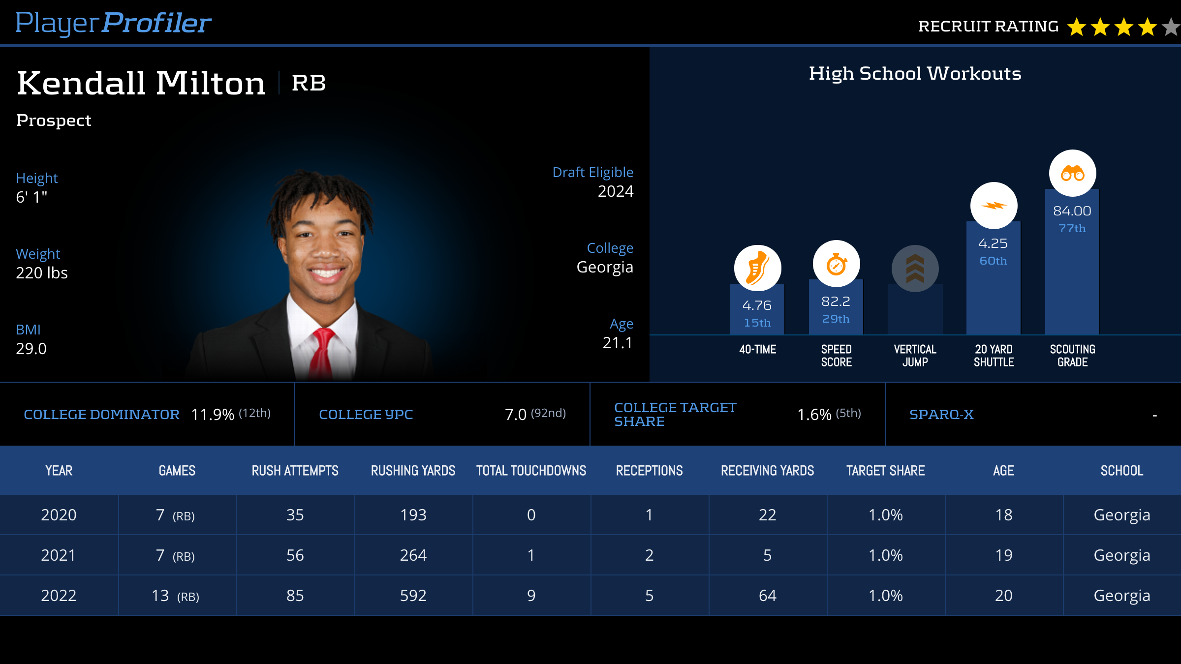 | Year Year | Games Games | Rush Attempts Rush Atts | Rushing Yards Rush Yrds | Total Touchdowns TDs | Receptions Rec | Receiving Yards Rec Yrds | Target Share Tgt Share | Age Age | School School |