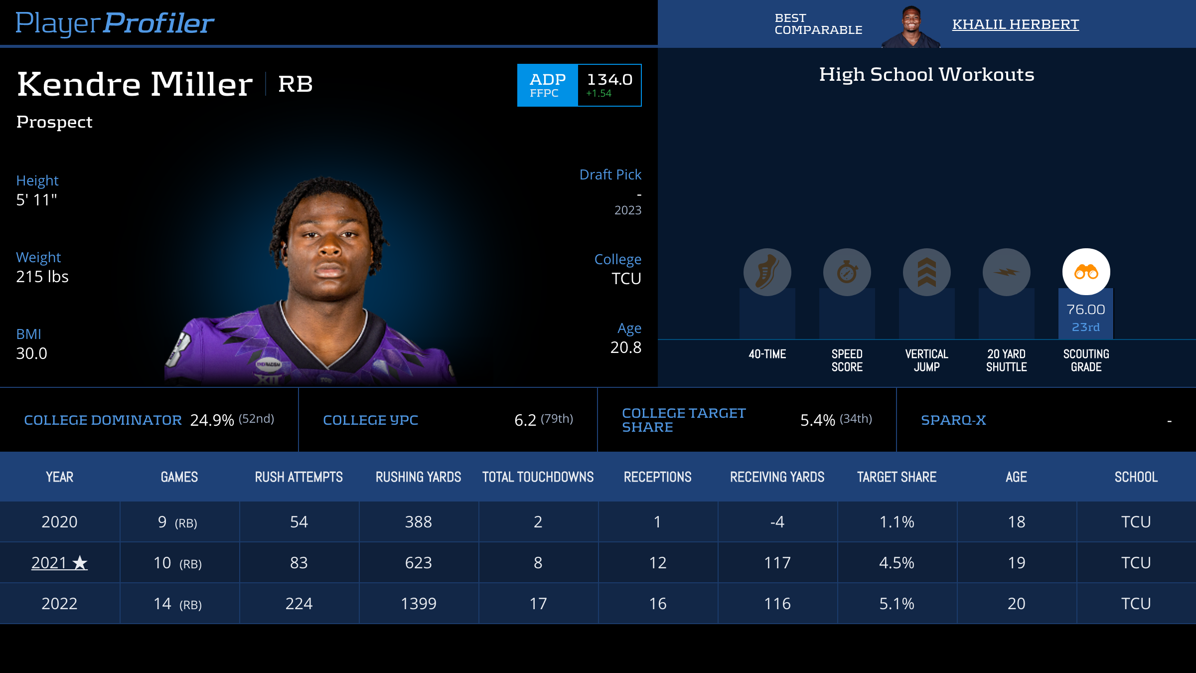 | Year Year | Games Games | Rush Attempts Rush Atts | Rushing Yards Rush Yrds | Total Touchdowns TDs | Receptions Rec | Receiving Yards Rec Yrds | Target Share Tgt Share | Age Age | School School |