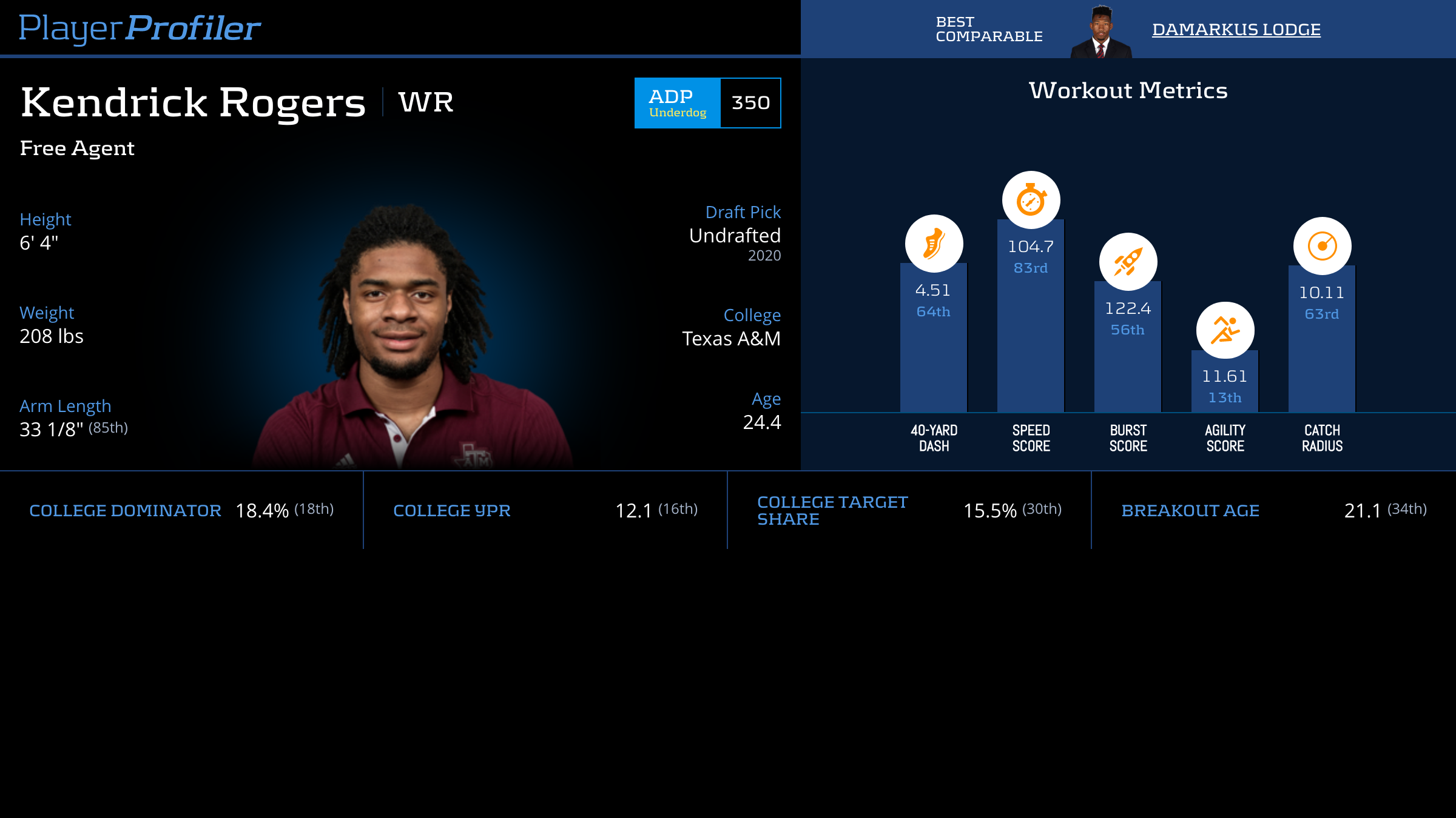 | Year Year | Games Games | Receptions Recs | Receiving Yards Rec Yds | Target Share Tgt Share | Catch Rate Catch Rate | Receiving Touchdowns Rec TDs | Special Teams Yards Special Teams | Age Age | School School |