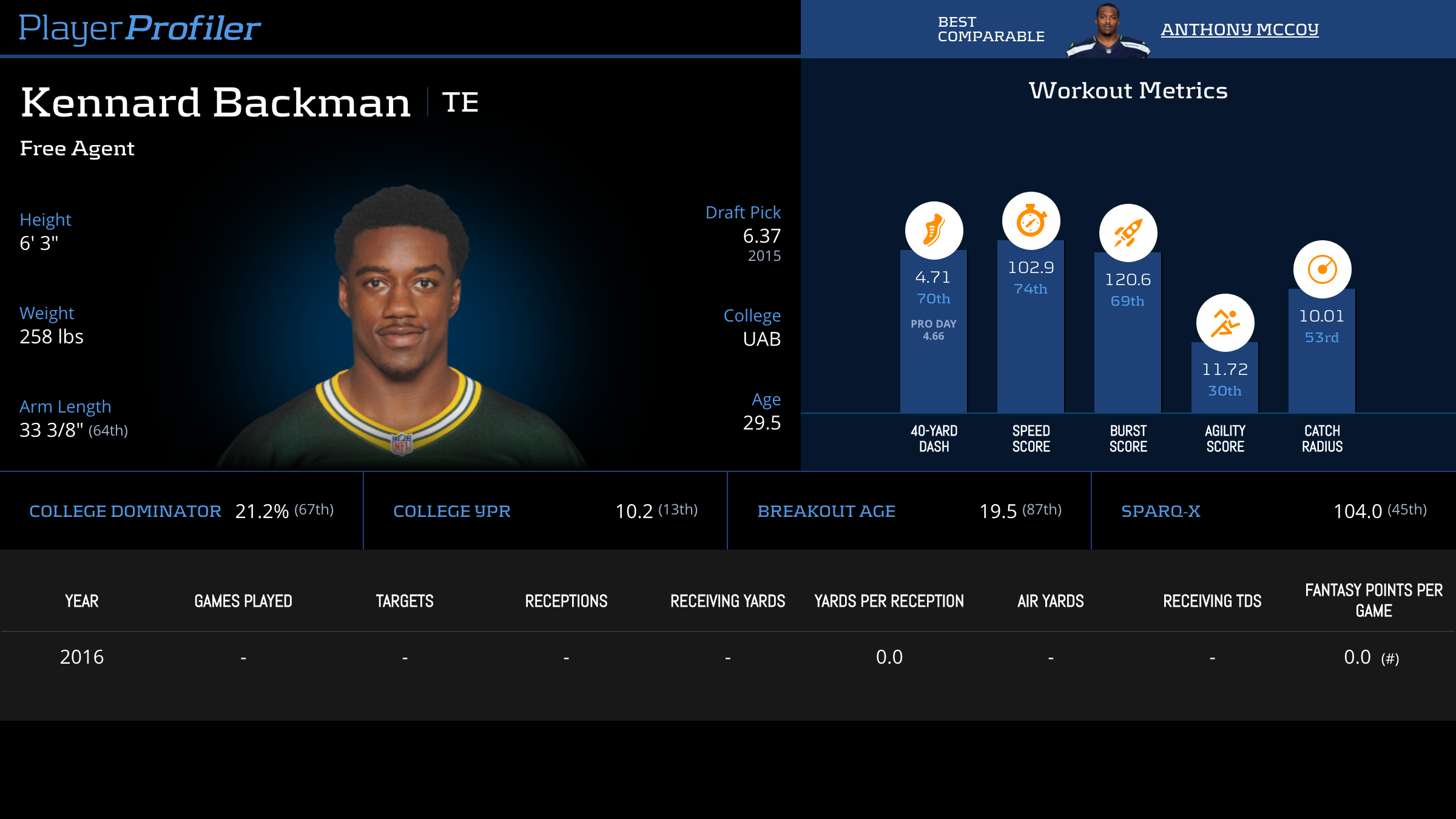 | Year Year | Games Games | Receptions Recs | Receiving Yards Rec Yds | Target Share Tgt Share | Catch Rate Catch Rate | Receiving Touchdowns Rec TDs | Special Teams Yards Special Teams | Age Age | School School |
