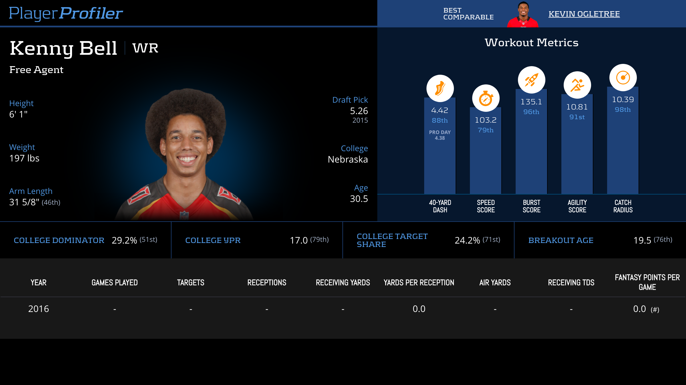 | Year Year | Games Games | Receptions Recs | Receiving Yards Rec Yds | Target Share Tgt Share | Catch Rate Catch Rate | Receiving Touchdowns Rec TDs | Special Teams Yards Special Teams | Age Age | School School |