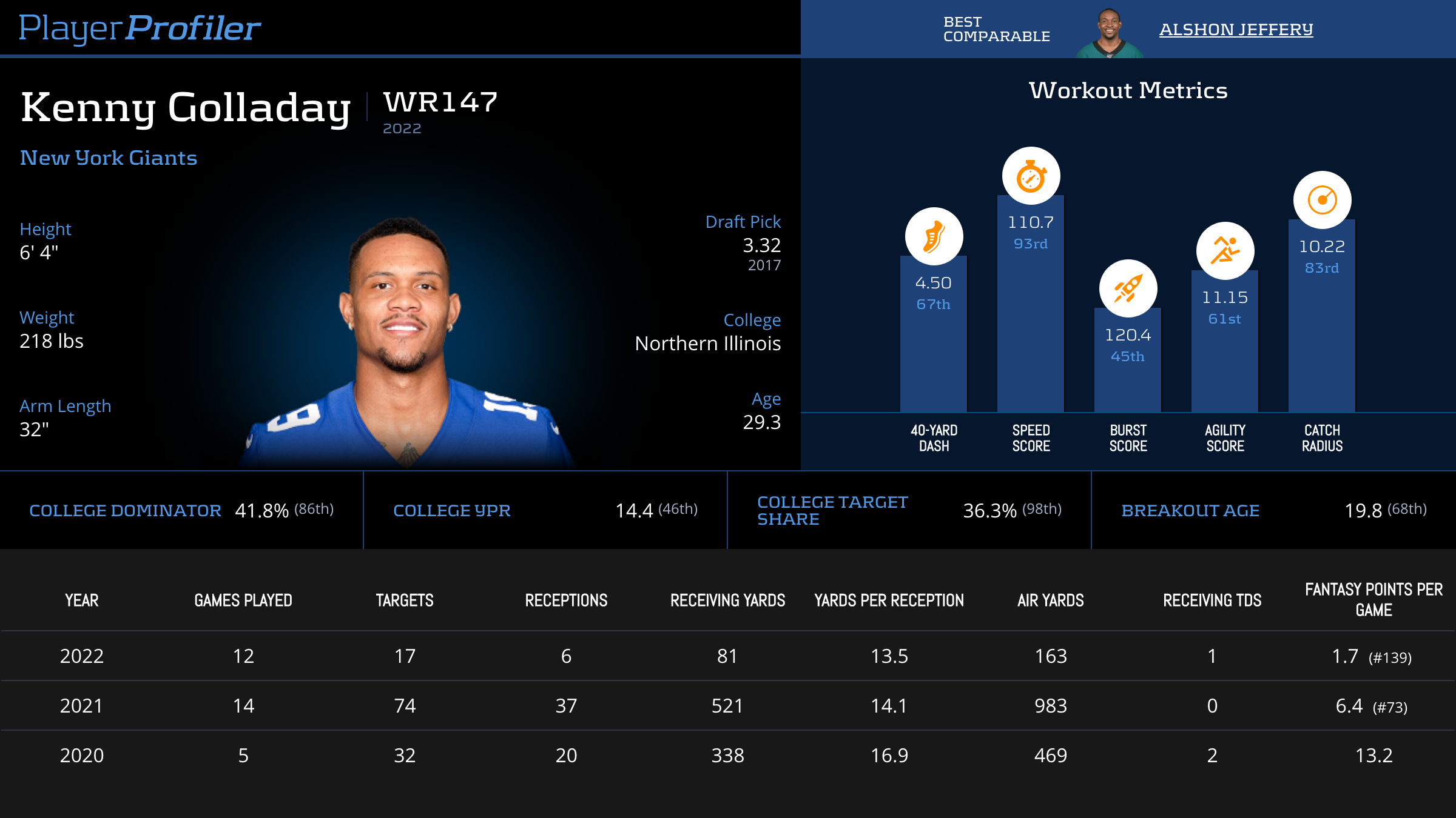 | Year Year | Games Games | Receptions Recs | Receiving Yards Rec Yds | Target Share Tgt Share | Catch Rate Catch Rate | Receiving Touchdowns Rec TDs | Special Teams Yards Special Teams | Age Age | School School |