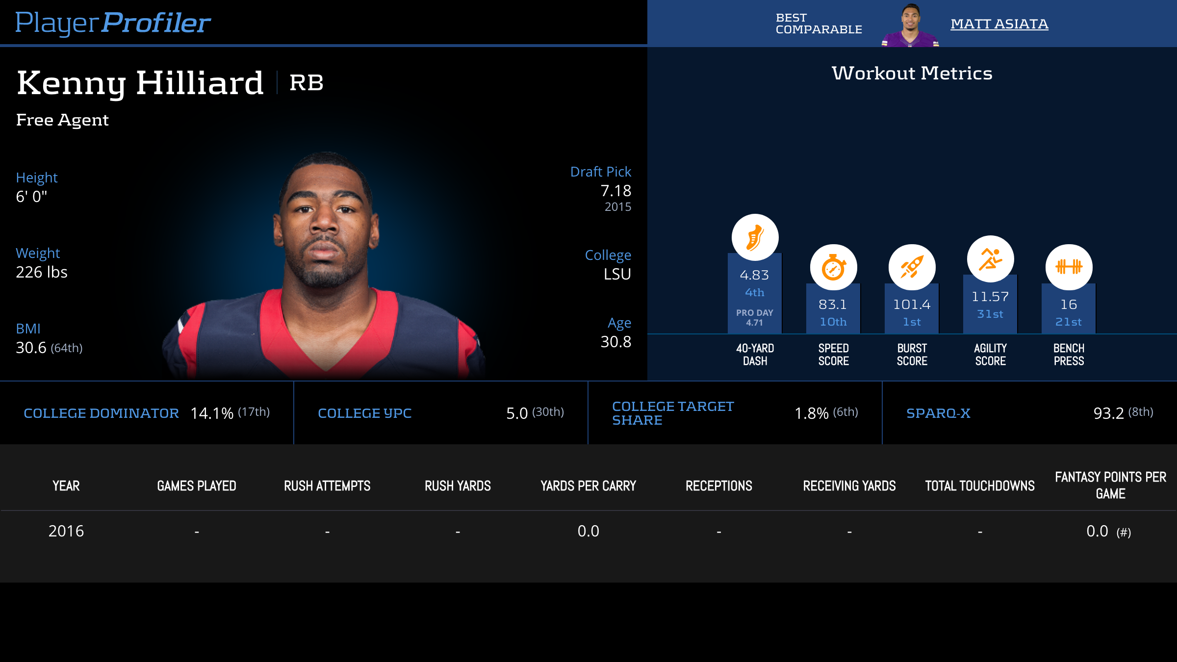 | Year Year | Games Games | Rush Attempts Rush Atts | Rushing Yards Rush Yrds | Total Touchdowns TDs | Receptions Rec | Receiving Yards Rec Yrds | Target Share Tgt Share | Age Age | School School |