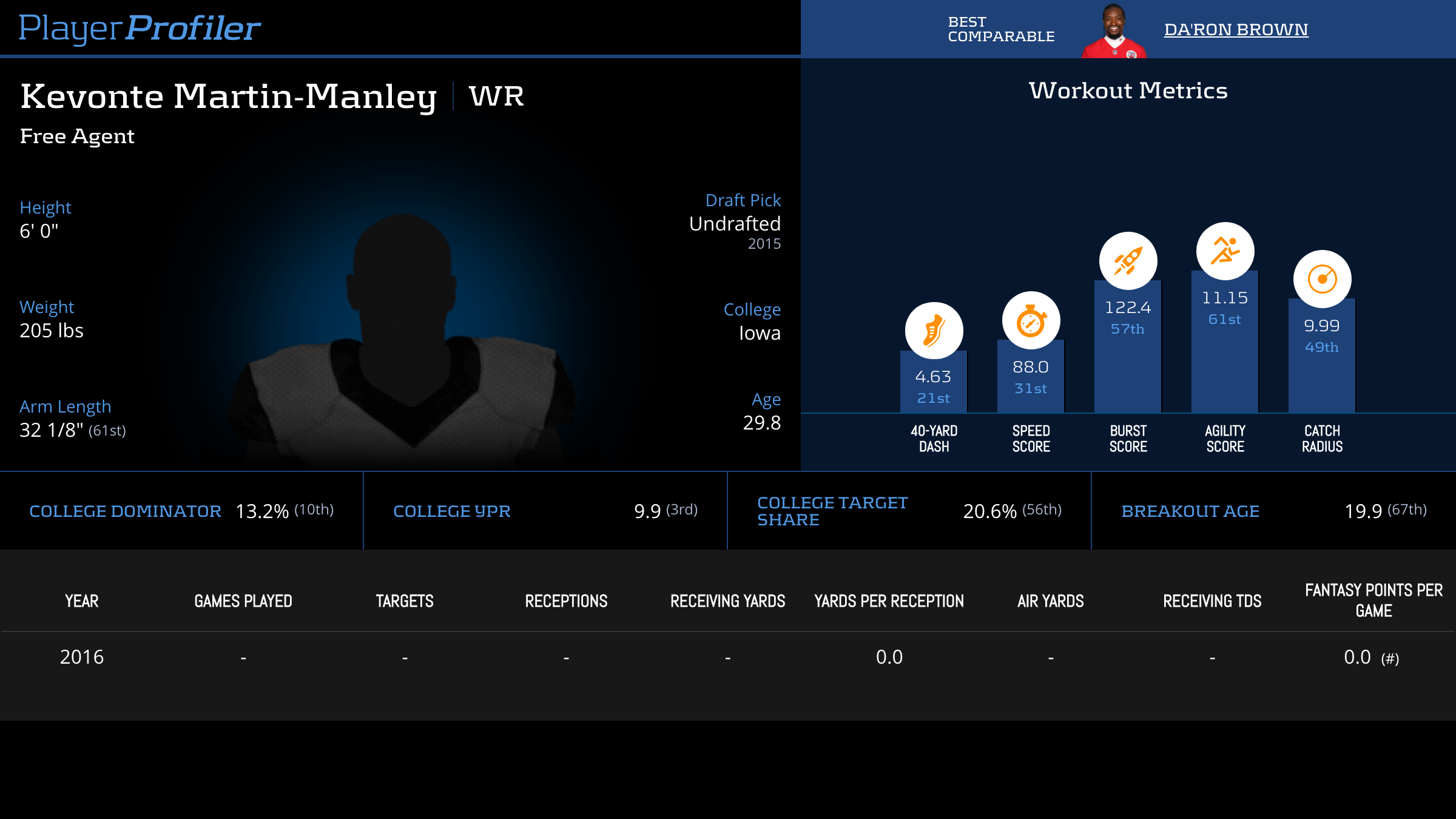 | Year Year | Games Games | Receptions Recs | Receiving Yards Rec Yds | Target Share Tgt Share | Catch Rate Catch Rate | Receiving Touchdowns Rec TDs | Special Teams Yards Special Teams | Age Age | School School |