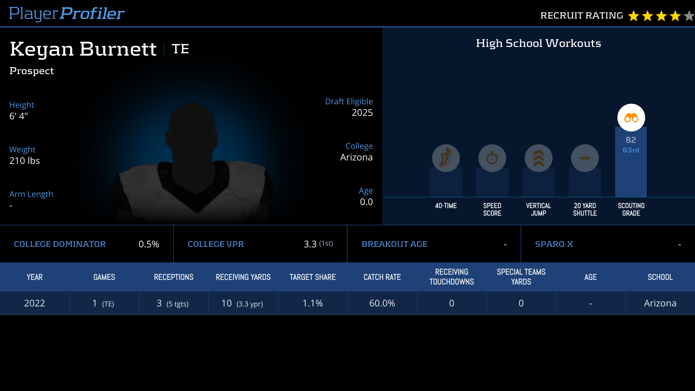 | Year Year | Games Games | Receptions Recs | Receiving Yards Rec Yds | Target Share Tgt Share | Catch Rate Catch Rate | Receiving Touchdowns Rec TDs | Special Teams Yards Special Teams | Age Age | School School |