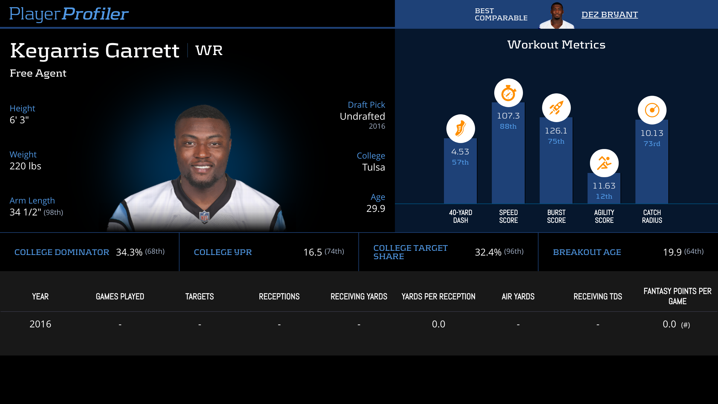 | Year Year | Games Games | Receptions Recs | Receiving Yards Rec Yds | Target Share Tgt Share | Catch Rate Catch Rate | Receiving Touchdowns Rec TDs | Special Teams Yards Special Teams | Age Age | School School |