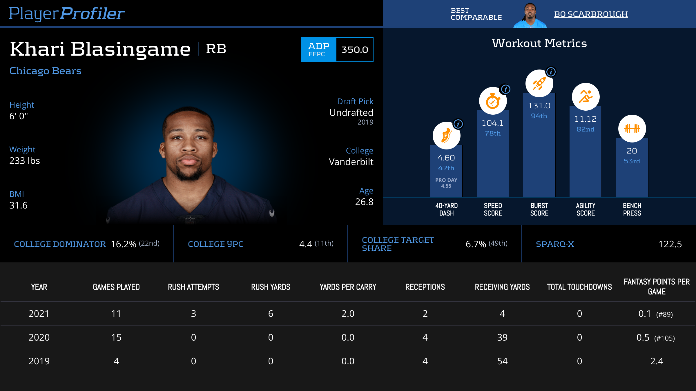 | Year Year | Games Games | Rush Attempts Rush Atts | Rushing Yards Rush Yrds | Total Touchdowns TDs | Receptions Rec | Receiving Yards Rec Yrds | Target Share Tgt Share | Age Age | School School |