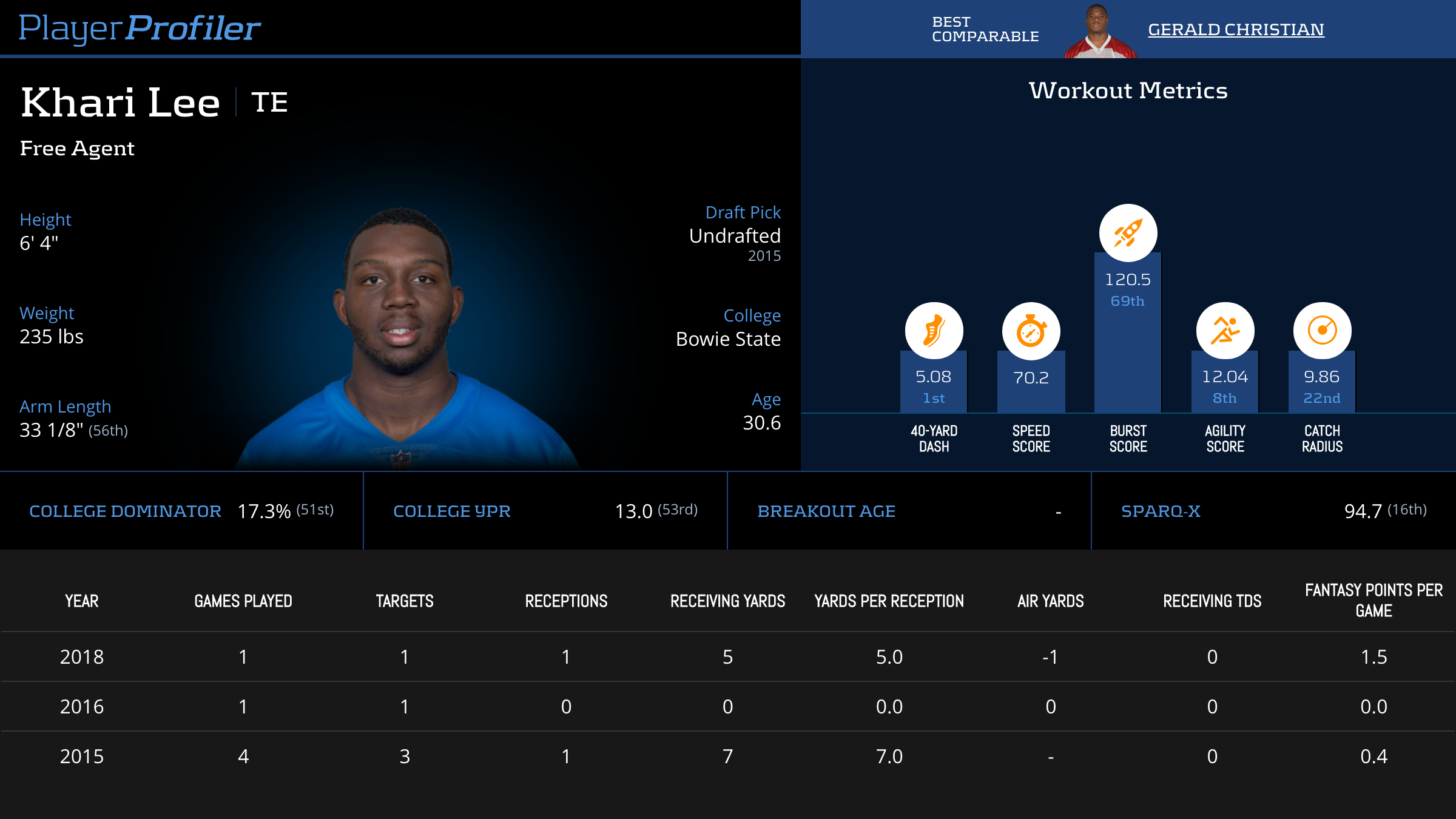 | Year Year | Games Games | Receptions Recs | Receiving Yards Rec Yds | Target Share Tgt Share | Catch Rate Catch Rate | Receiving Touchdowns Rec TDs | Special Teams Yards Special Teams | Age Age | School School |