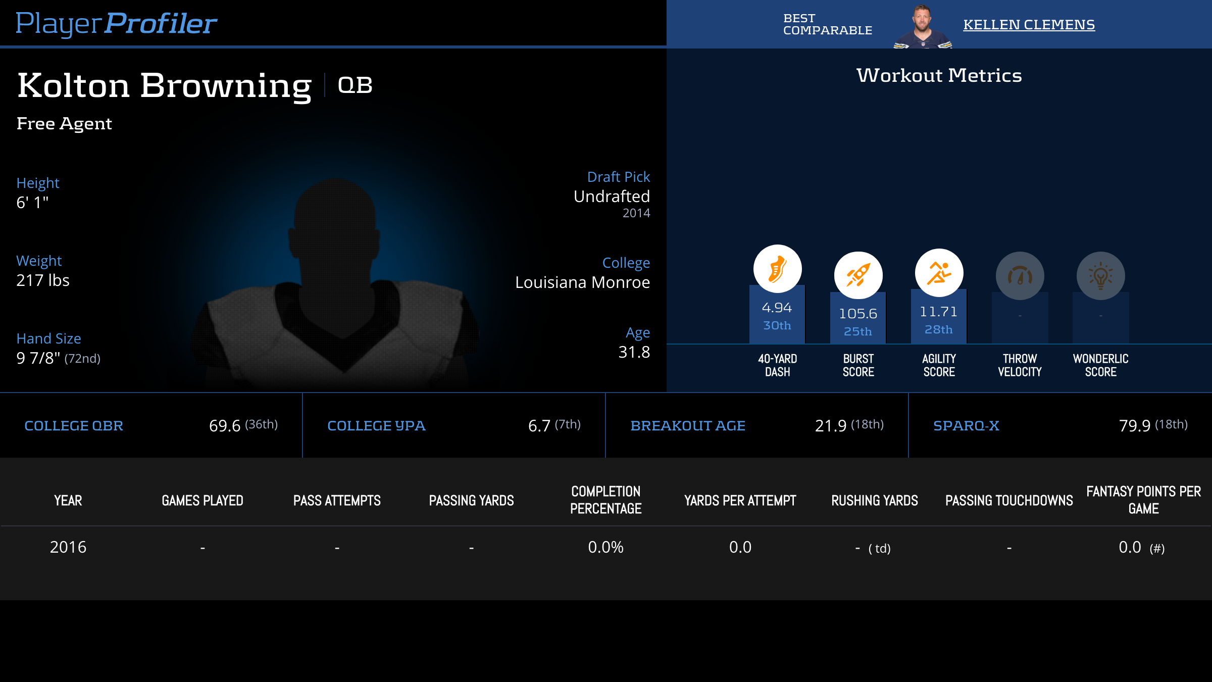| Year Year | Games Games | Pass Attempts Pass Atts | Passing Yards Pass Yds | Yards Per Attempt YPA | Completion Percentage Comp % | Passing Touchdowns Pass TDs | Rushing Yards Rush Yds | Age Age | School School |