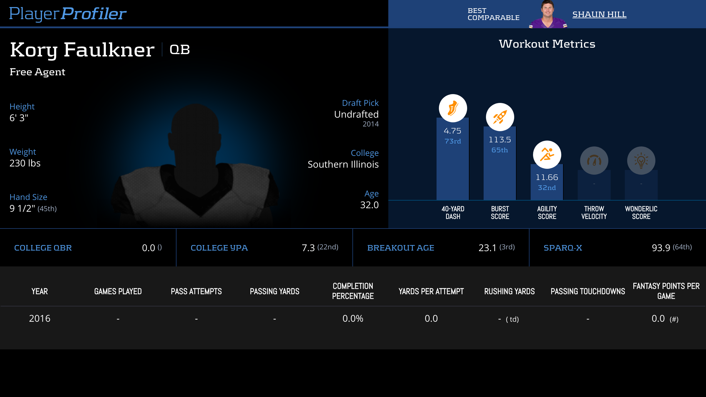 | Year Year | Games Games | Pass Attempts Pass Atts | Passing Yards Pass Yds | Yards Per Attempt YPA | Completion Percentage Comp % | Passing Touchdowns Pass TDs | Rushing Yards Rush Yds | Age Age | School School |