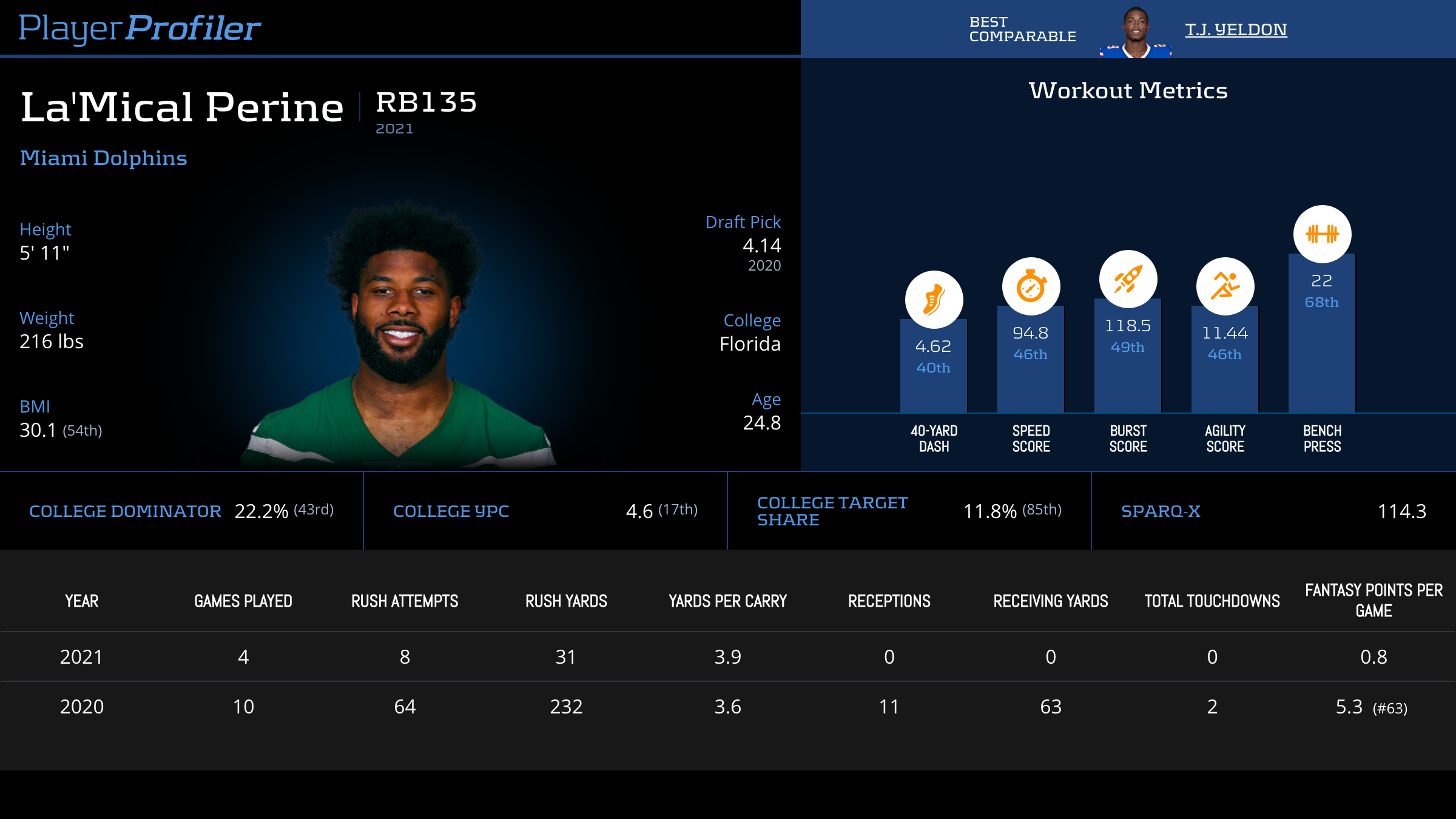 | Year Year | Games Games | Rush Attempts Rush Atts | Rushing Yards Rush Yrds | Total Touchdowns TDs | Receptions Rec | Receiving Yards Rec Yrds | Target Share Tgt Share | Age Age | School School |