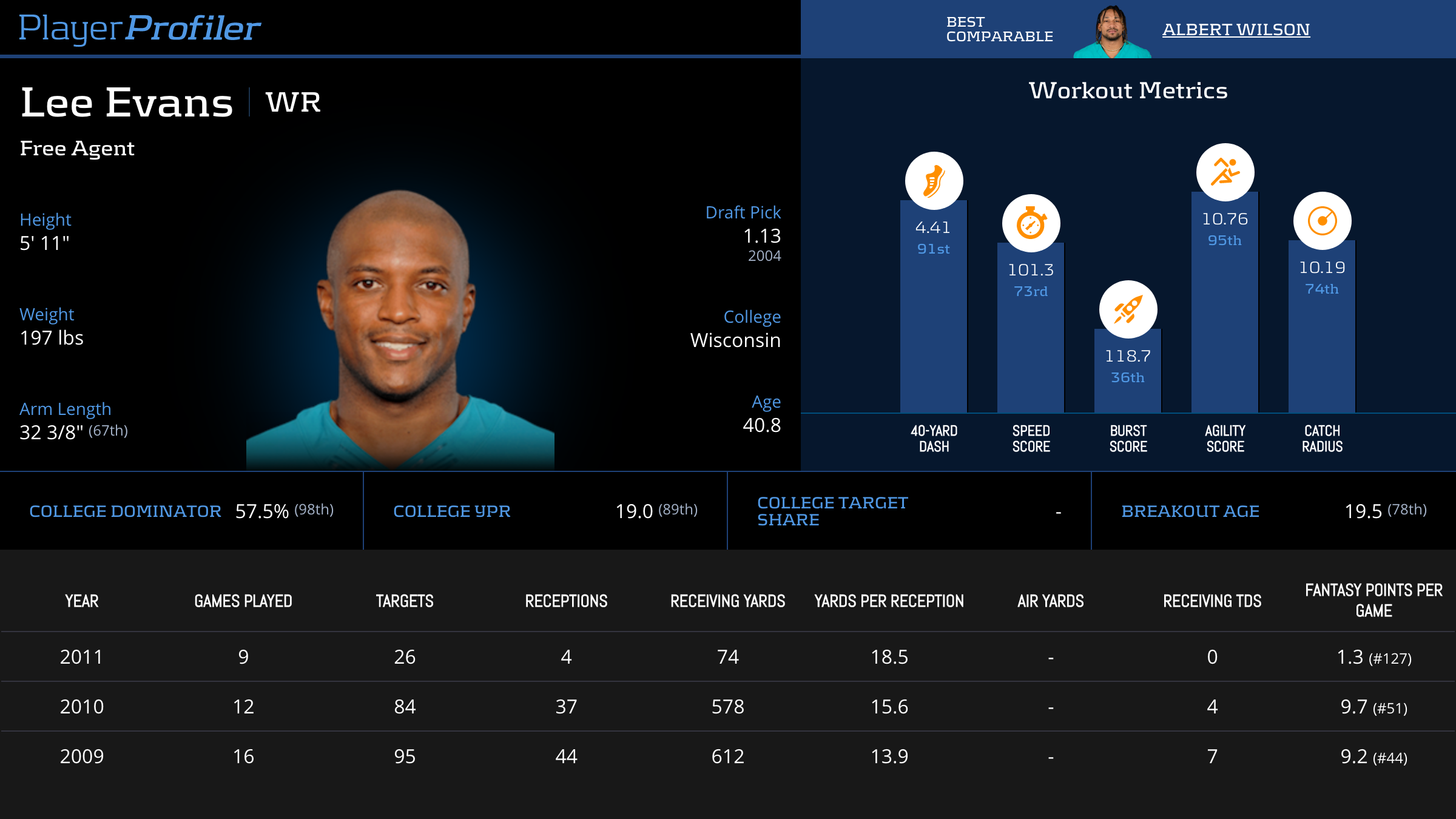 Box score statistics such as targets, yards, touchdowns, and fantasy points per target are updated the next day. Advanced stats and metrics are updated later in the week during the NFL season.