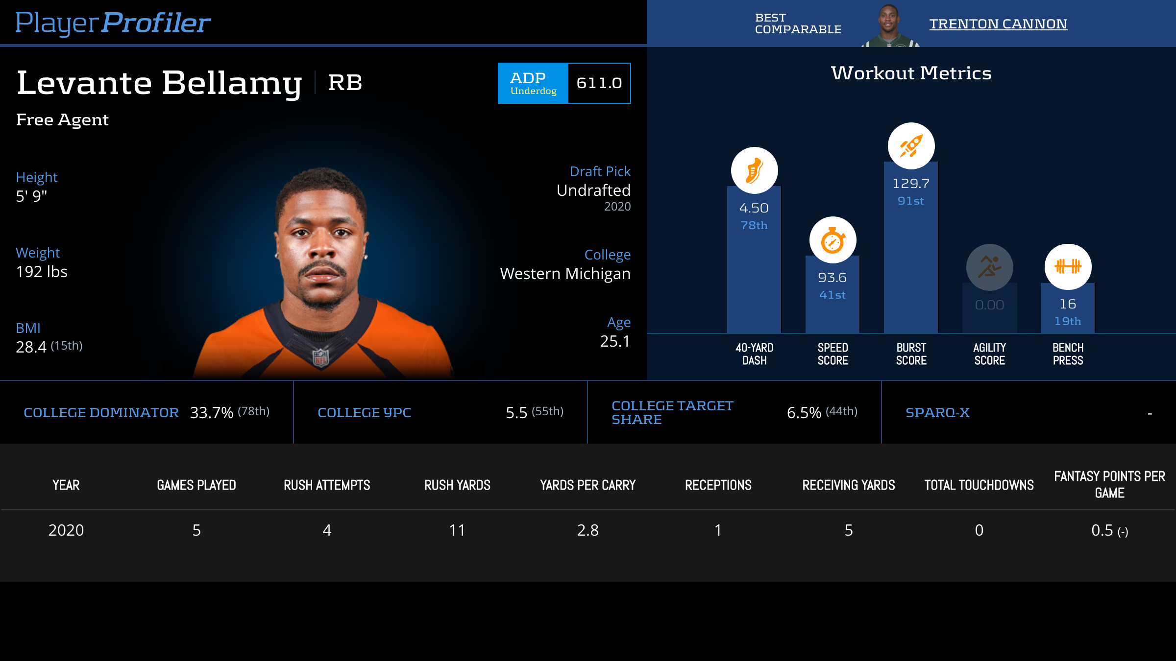 Box score statistics such as targets, yards, touchdowns, and fantasy points per target are updated the next day. Advanced stats and metrics are updated later in the week during the NFL season.