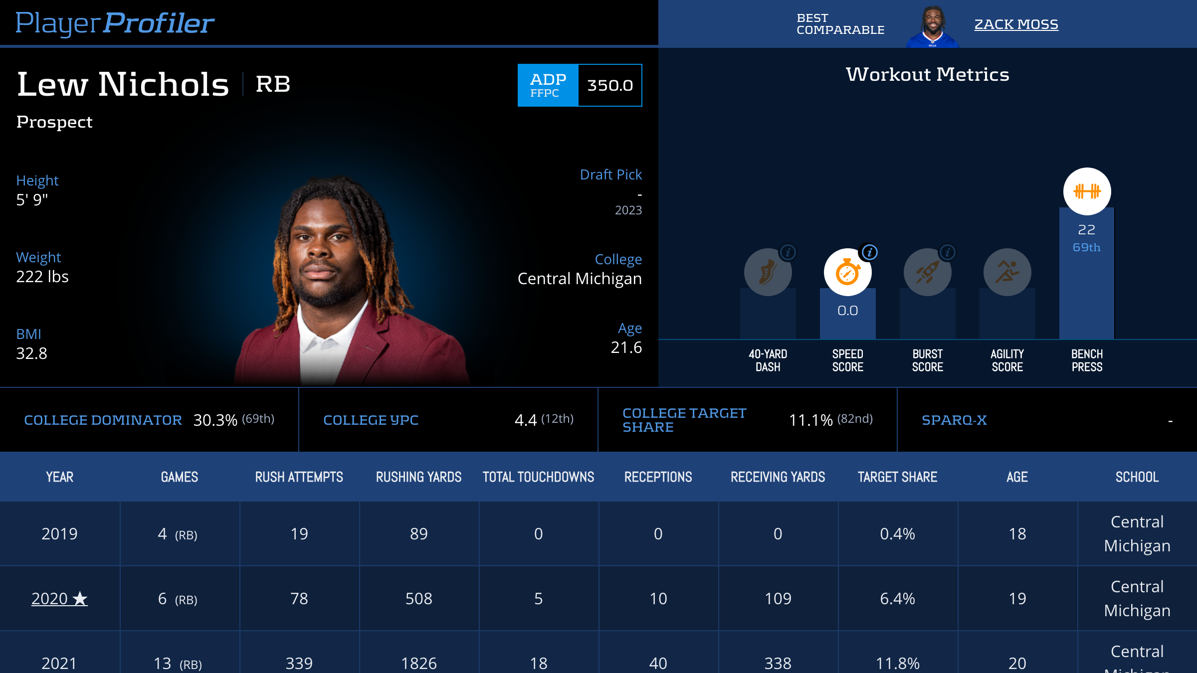 | Year Year | Games Games | Rush Attempts Rush Atts | Rushing Yards Rush Yrds | Total Touchdowns TDs | Receptions Rec | Receiving Yards Rec Yrds | Target Share Tgt Share | Age Age | School School |