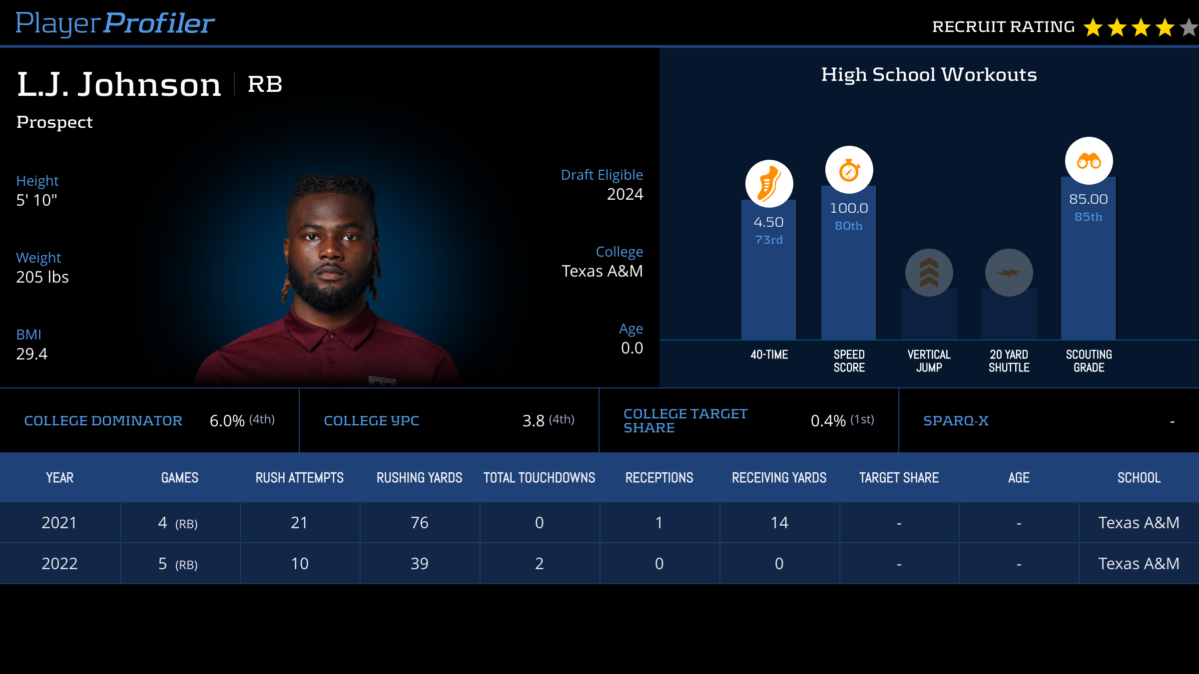 | Year Year | Games Games | Rush Attempts Rush Atts | Rushing Yards Rush Yrds | Total Touchdowns TDs | Receptions Rec | Receiving Yards Rec Yrds | Target Share Tgt Share | Age Age | School School |