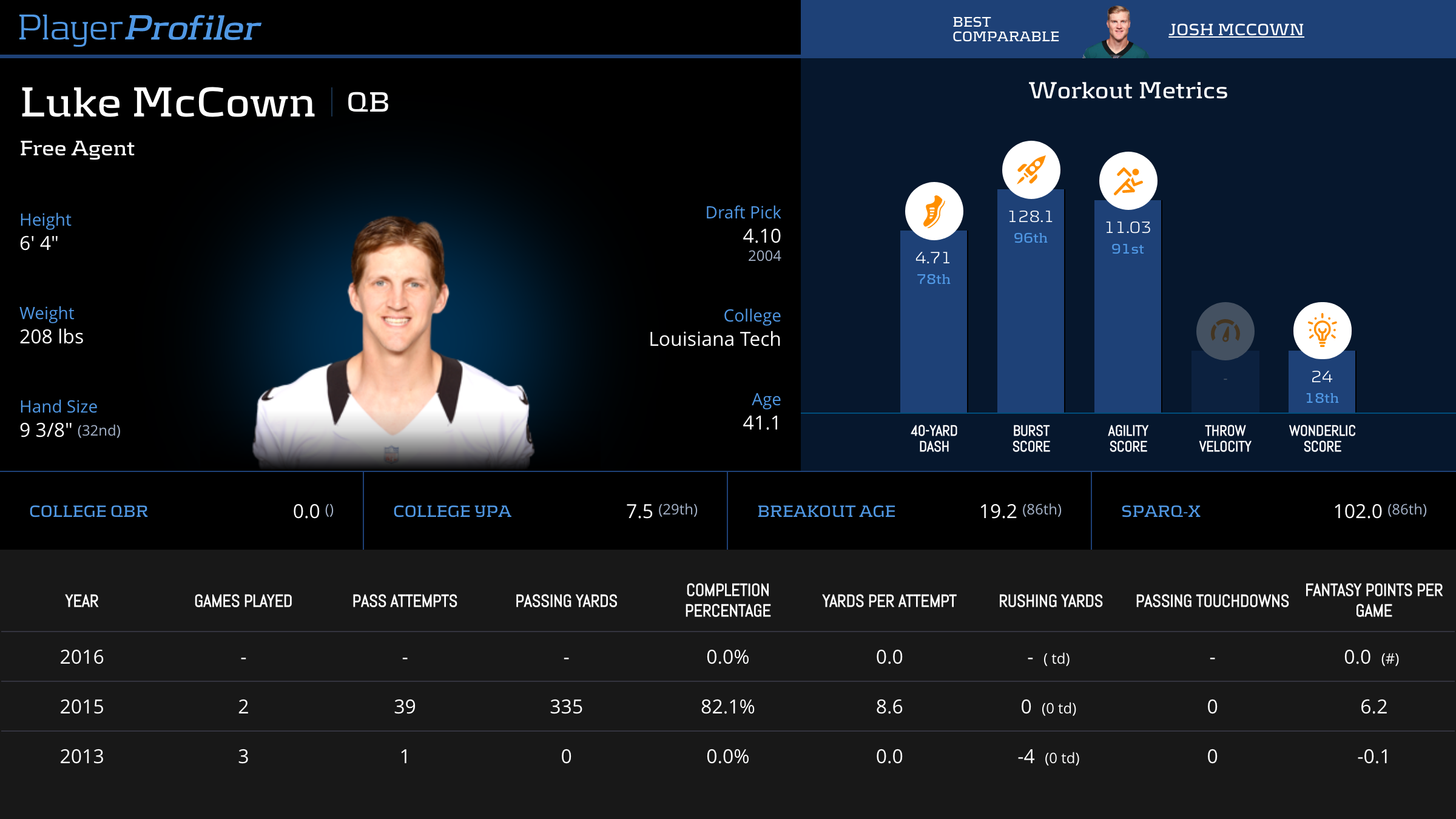 | Year Year | Games Games | Pass Attempts Pass Atts | Passing Yards Pass Yds | Yards Per Attempt YPA | Completion Percentage Comp % | Passing Touchdowns Pass TDs | Rushing Yards Rush Yds | Age Age | School School |