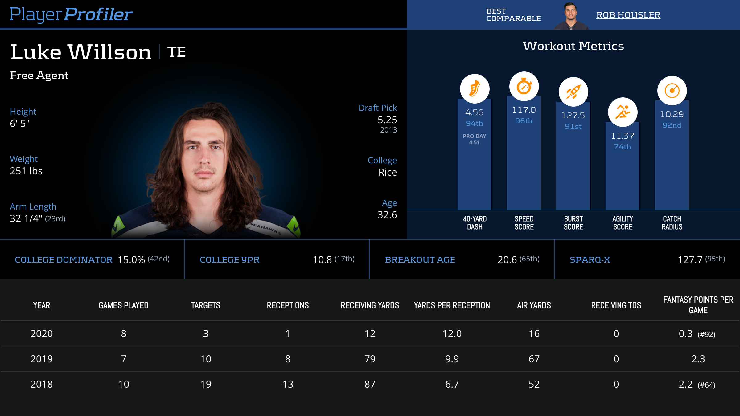 | Year Year | Games Games | Receptions Recs | Receiving Yards Rec Yds | Target Share Tgt Share | Catch Rate Catch Rate | Receiving Touchdowns Rec TDs | Special Teams Yards Special Teams | Age Age | School School |