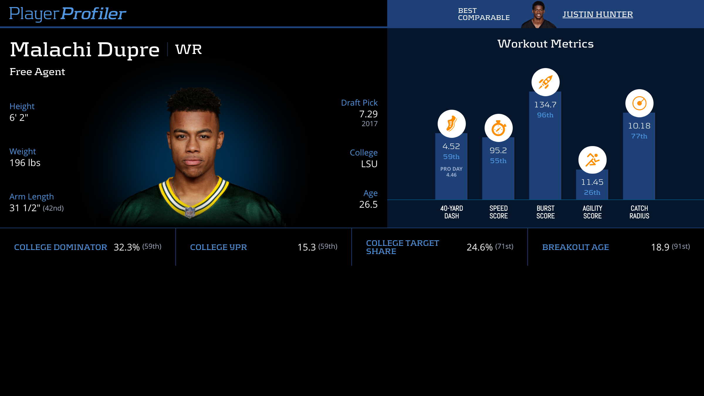 | Year Year | Games Games | Receptions Recs | Receiving Yards Rec Yds | Target Share Tgt Share | Catch Rate Catch Rate | Receiving Touchdowns Rec TDs | Special Teams Yards Special Teams | Age Age | School School |