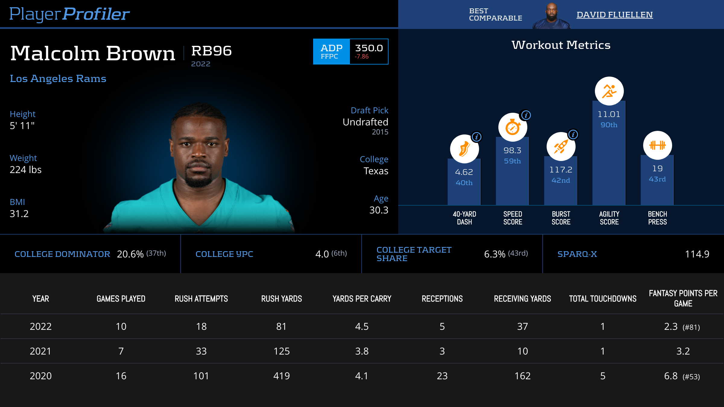 | Year Year | Games Games | Rush Attempts Rush Atts | Rushing Yards Rush Yrds | Total Touchdowns TDs | Receptions Rec | Receiving Yards Rec Yrds | Target Share Tgt Share | Age Age | School School |