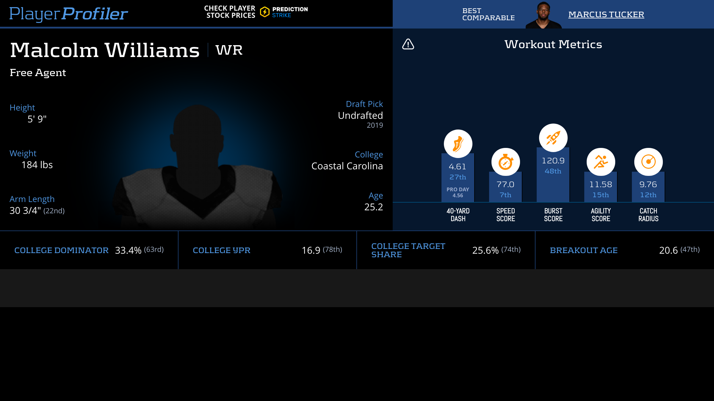 | Year Year | Games Games | Receptions Recs | Receiving Yards Rec Yds | Target Share Tgt Share | Catch Rate Catch Rate | Receiving Touchdowns Rec TDs | Special Teams Yards Special Teams | Age Age | School School |