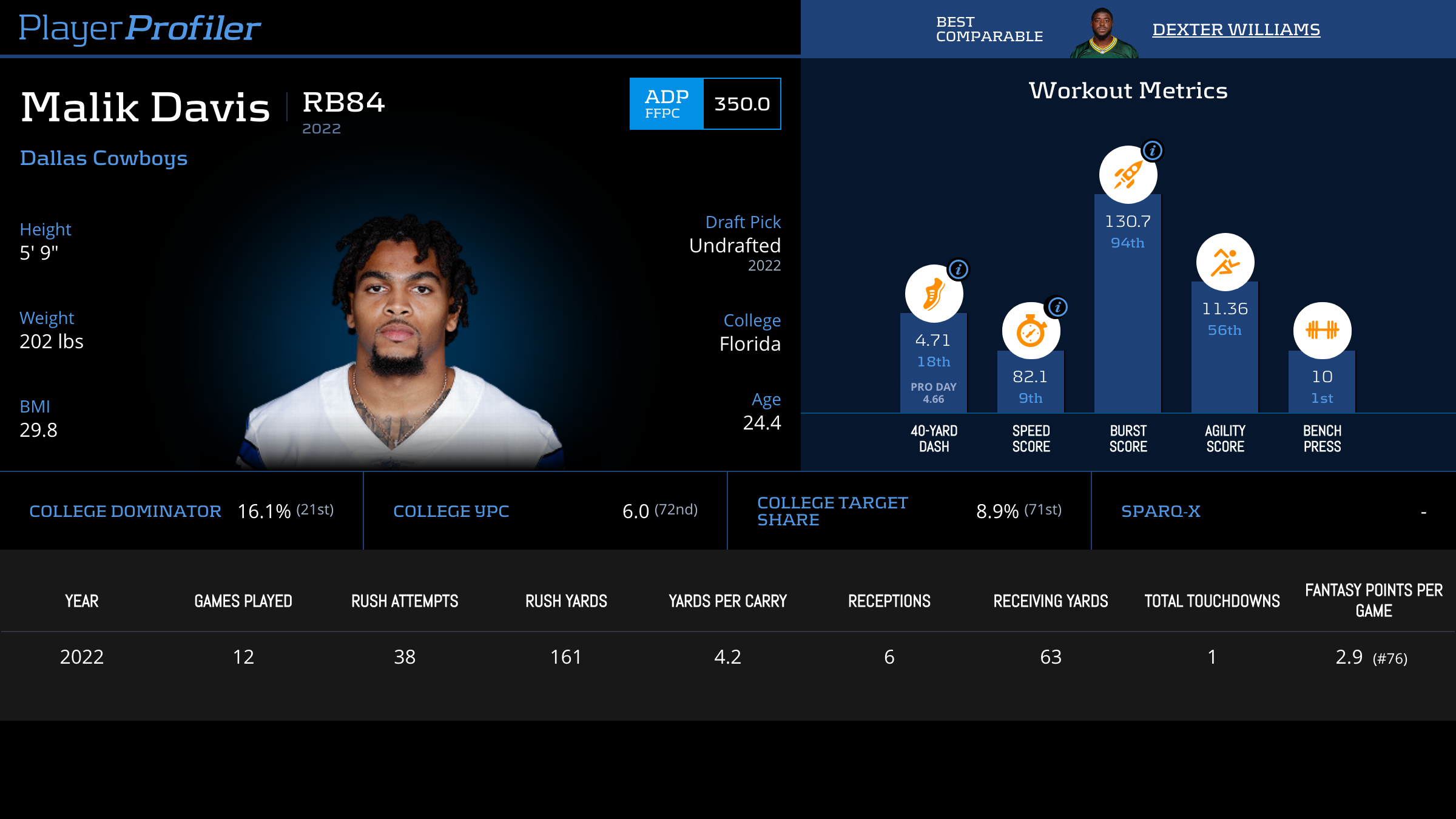 | Year Year | Games Games | Rush Attempts Rush Atts | Rushing Yards Rush Yrds | Total Touchdowns TDs | Receptions Rec | Receiving Yards Rec Yrds | Target Share Tgt Share | Age Age | School School |