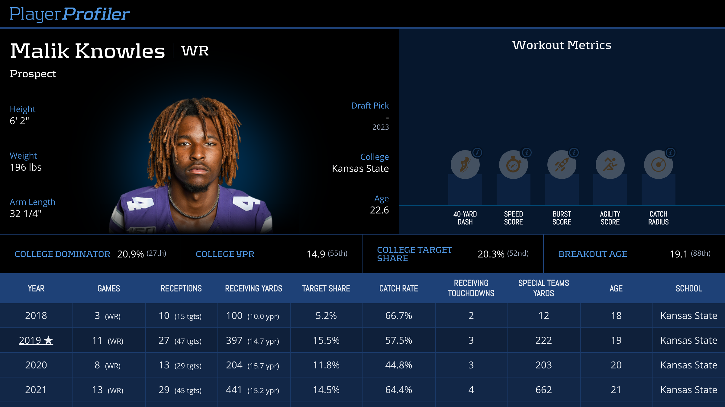 | Year Year | Games Games | Receptions Recs | Receiving Yards Rec Yds | Target Share Tgt Share | Catch Rate Catch Rate | Receiving Touchdowns Rec TDs | Special Teams Yards Special Teams | Age Age | School School |