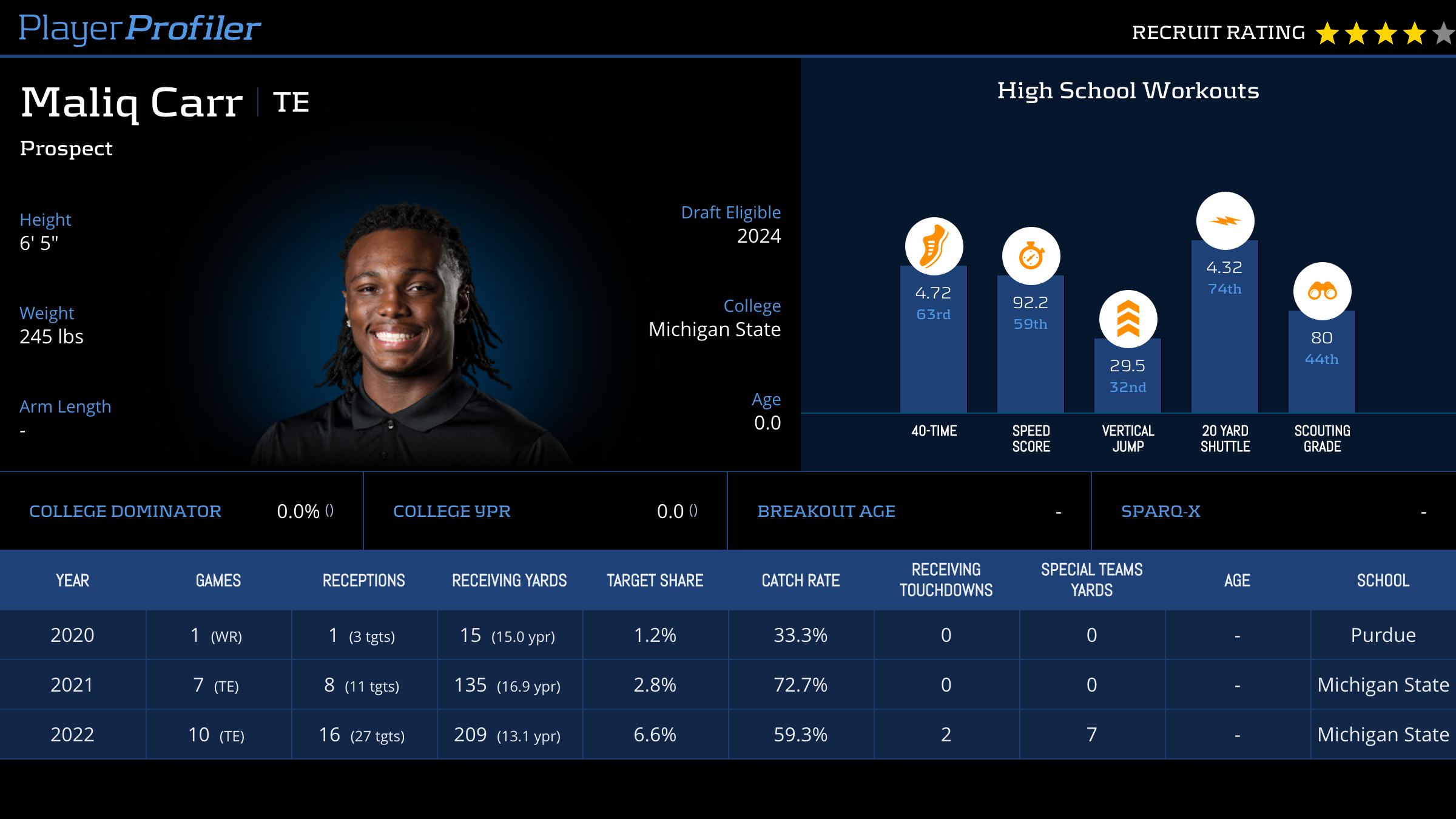 | Year Year | Games Games | Receptions Recs | Receiving Yards Rec Yds | Target Share Tgt Share | Catch Rate Catch Rate | Receiving Touchdowns Rec TDs | Special Teams Yards Special Teams | Age Age | School School |