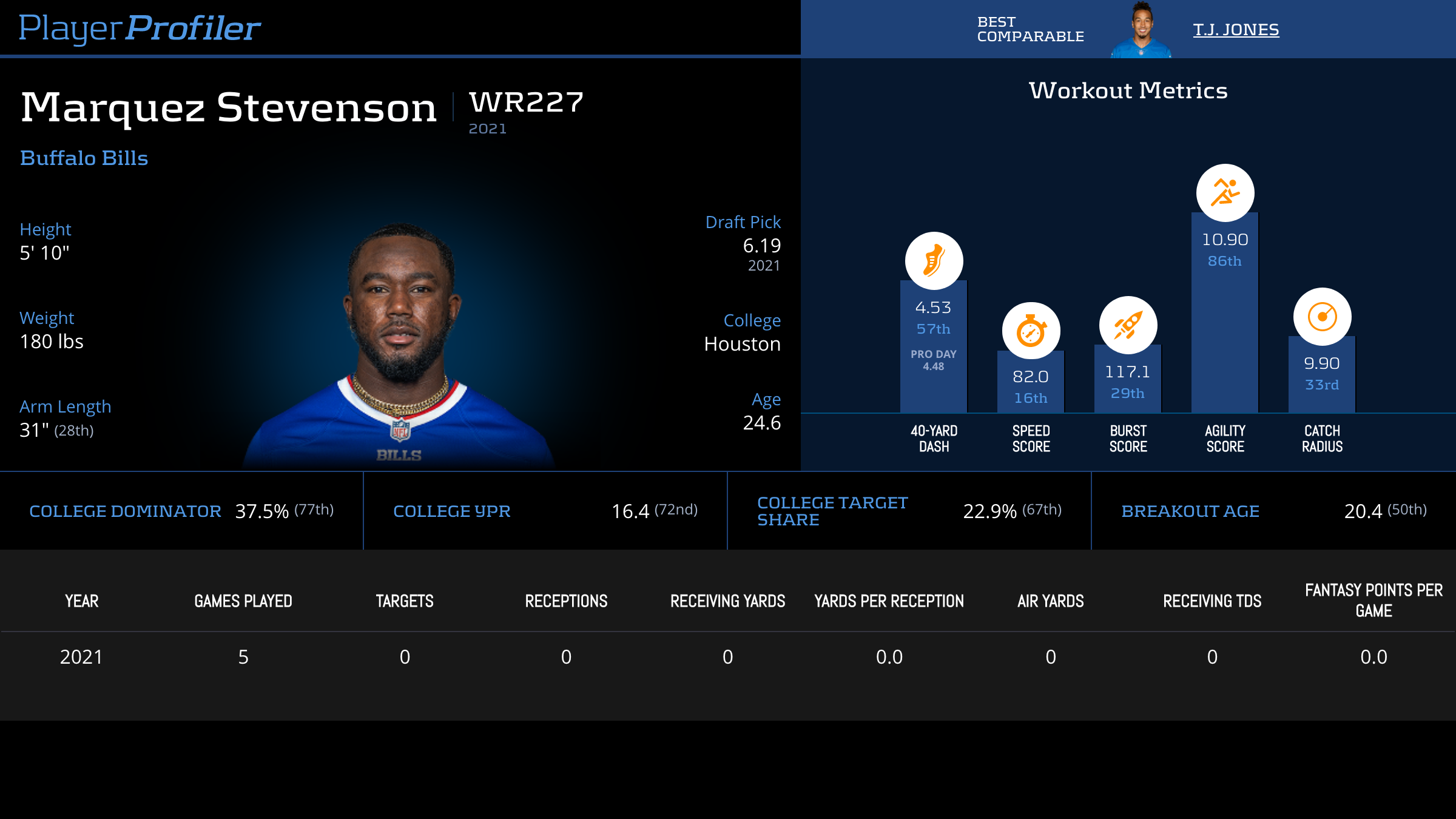 | Year Year | Games Games | Receptions Recs | Receiving Yards Rec Yds | Target Share Tgt Share | Catch Rate Catch Rate | Receiving Touchdowns Rec TDs | Special Teams Yards Special Teams | Age Age | School School |