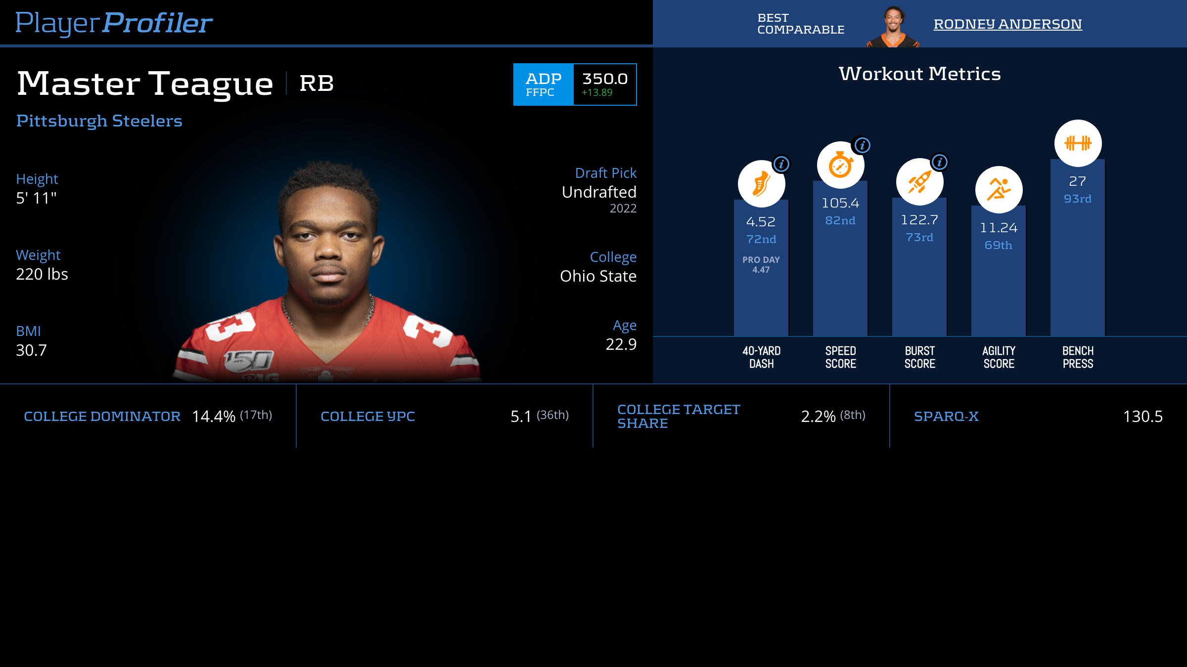 Year Games Rush Atts Rush Yrds TDs Rec Rec Yrds Tgt Share Age School