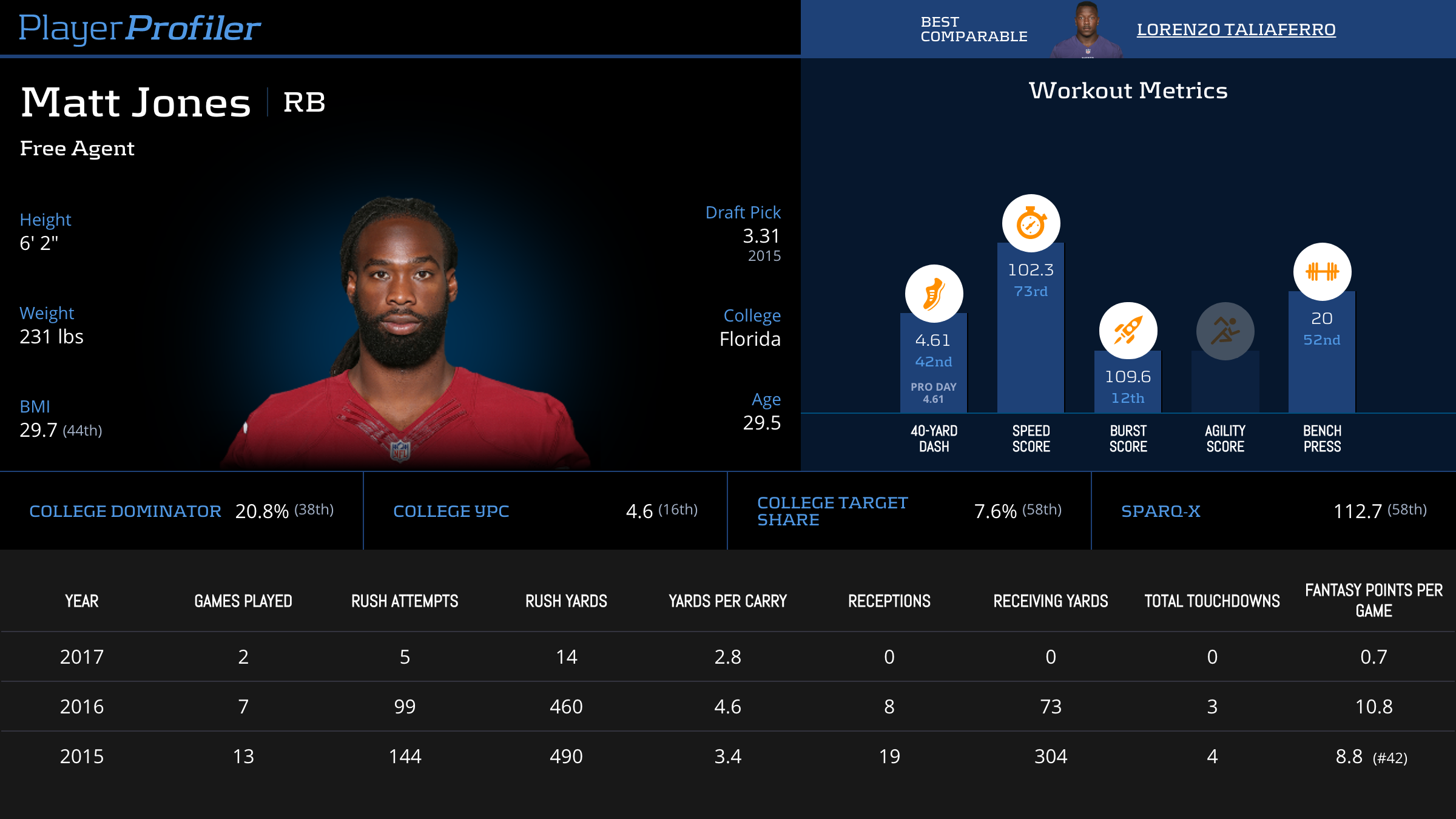 Value Over Stream: Valuation scheme calculates a player's fantasy pts/game over the average waiver wire replacement in standard fantasy league formats during either the current season (or previous year during the offseason) and adjusts for positional bust rates. VOS rank in parenthesis spans all positions, enabling player comparisons across QB's, RB's, WR's, and TE's.