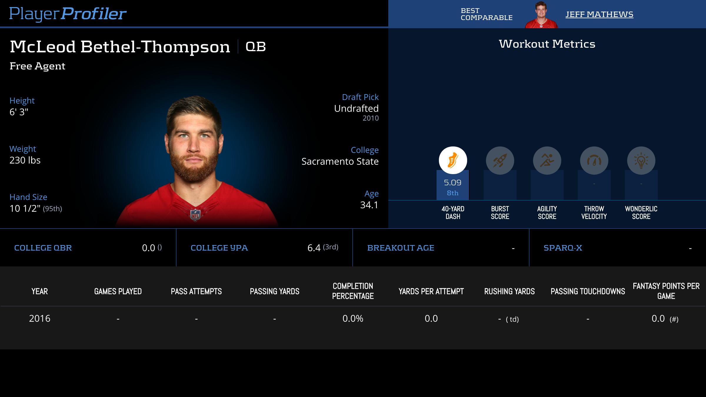| Year Year | Games Games | Pass Attempts Pass Atts | Passing Yards Pass Yds | Yards Per Attempt YPA | Completion Percentage Comp % | Passing Touchdowns Pass TDs | Rushing Yards Rush Yds | Age Age | School School |