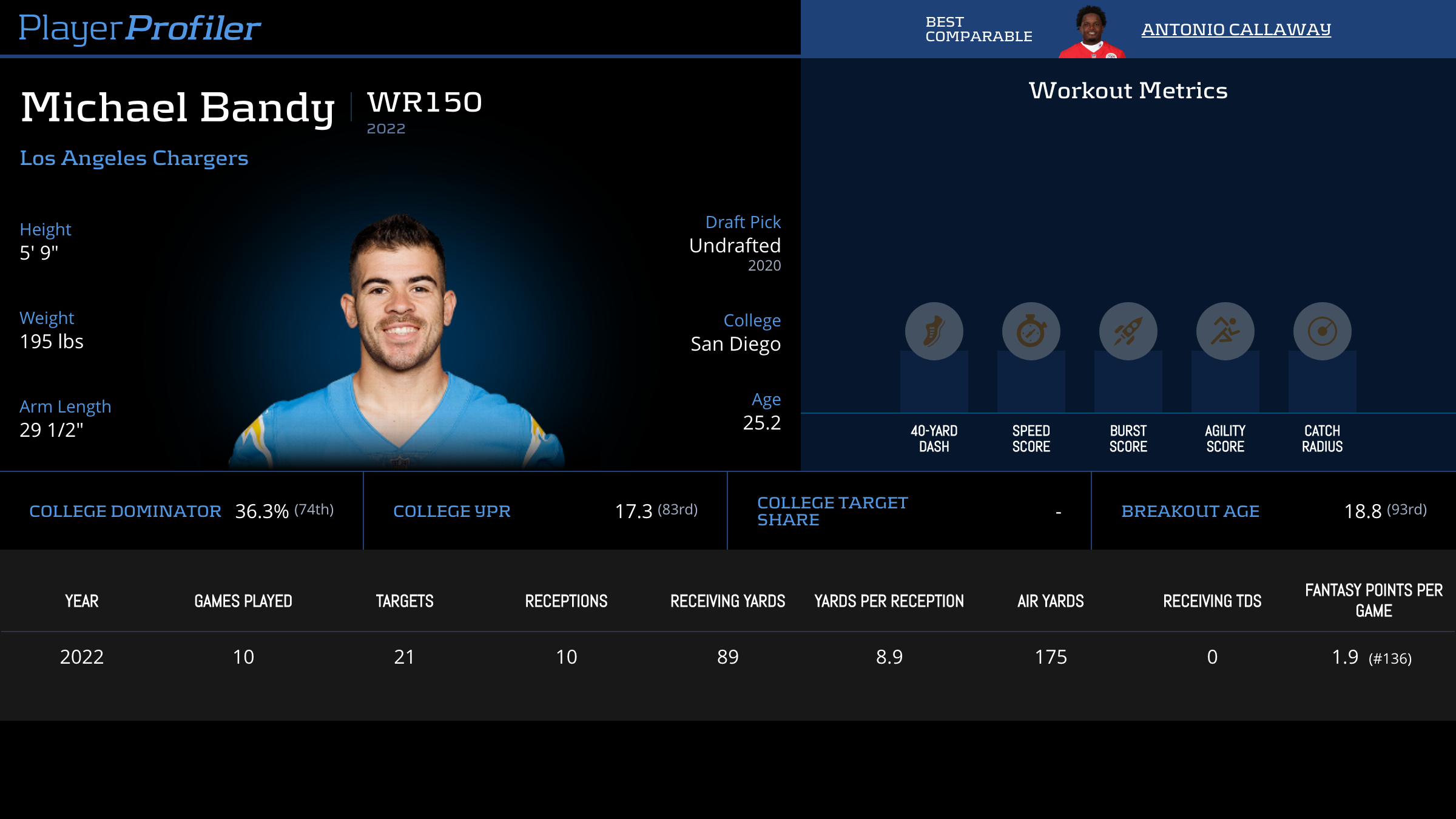Box score statistics such as targets, yards, touchdowns, and fantasy points per target are updated the next day. Advanced stats and metrics are updated later in the week during the NFL season.