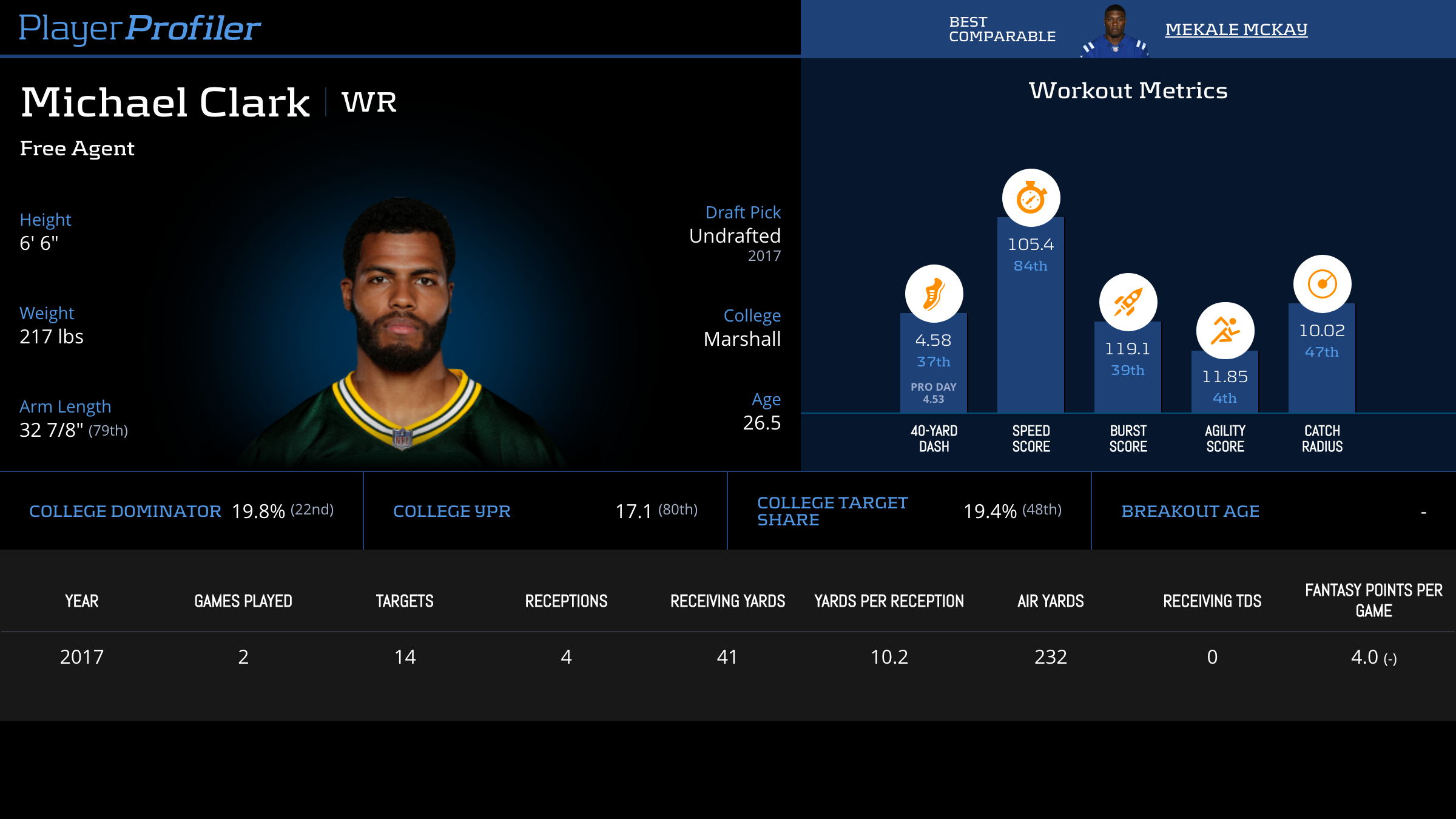 | Year Year | Games Games | Receptions Recs | Receiving Yards Rec Yds | Target Share Tgt Share | Catch Rate Catch Rate | Receiving Touchdowns Rec TDs | Special Teams Yards Special Teams | Age Age | School School |