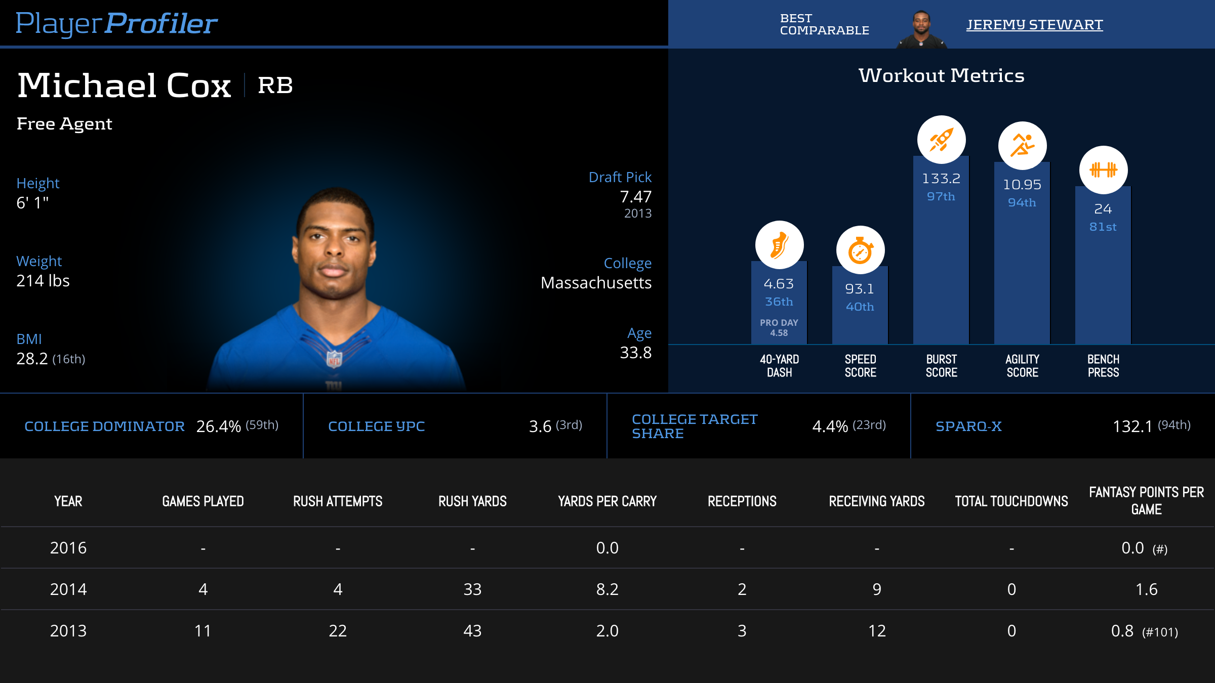 | Year Year | Games Games | Rush Attempts Rush Atts | Rushing Yards Rush Yrds | Total Touchdowns TDs | Receptions Rec | Receiving Yards Rec Yrds | Target Share Tgt Share | Age Age | School School |