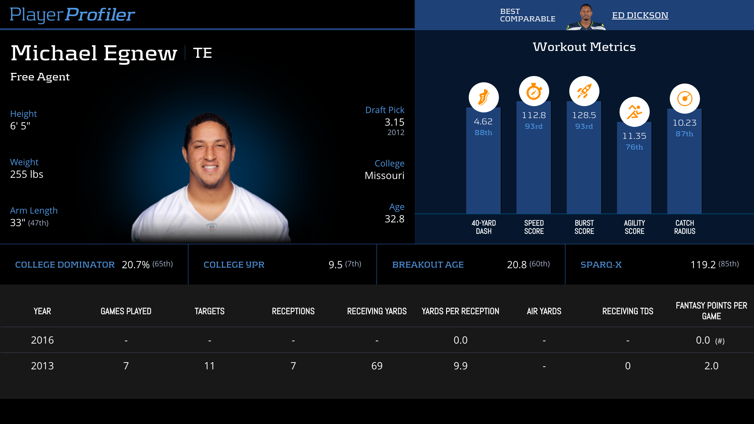 | Year Year | Games Games | Receptions Recs | Receiving Yards Rec Yds | Target Share Tgt Share | Catch Rate Catch Rate | Receiving Touchdowns Rec TDs | Special Teams Yards Special Teams | Age Age | School School |