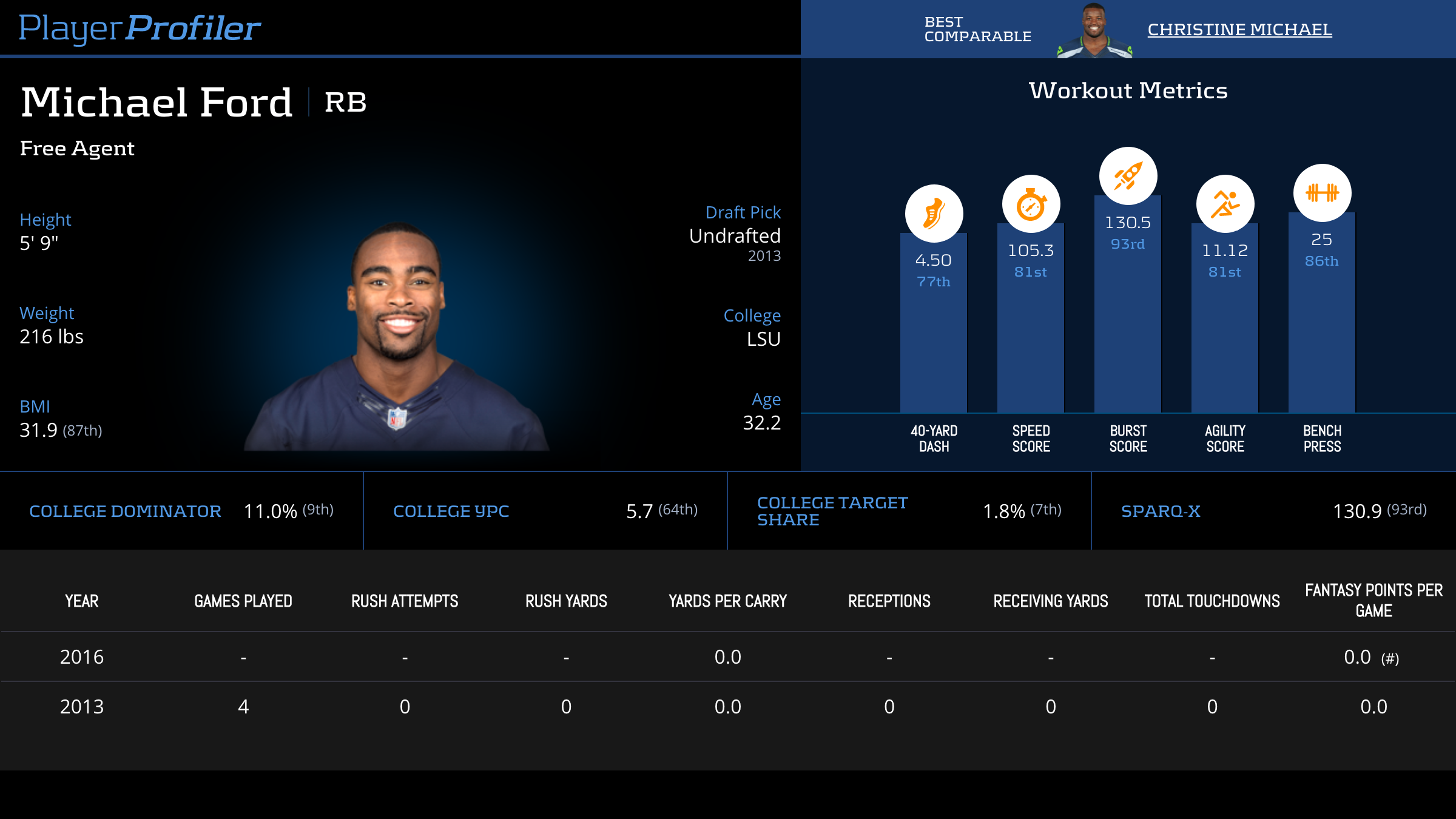 | Year Year | Games Games | Rush Attempts Rush Atts | Rushing Yards Rush Yrds | Total Touchdowns TDs | Receptions Rec | Receiving Yards Rec Yrds | Target Share Tgt Share | Age Age | School School |