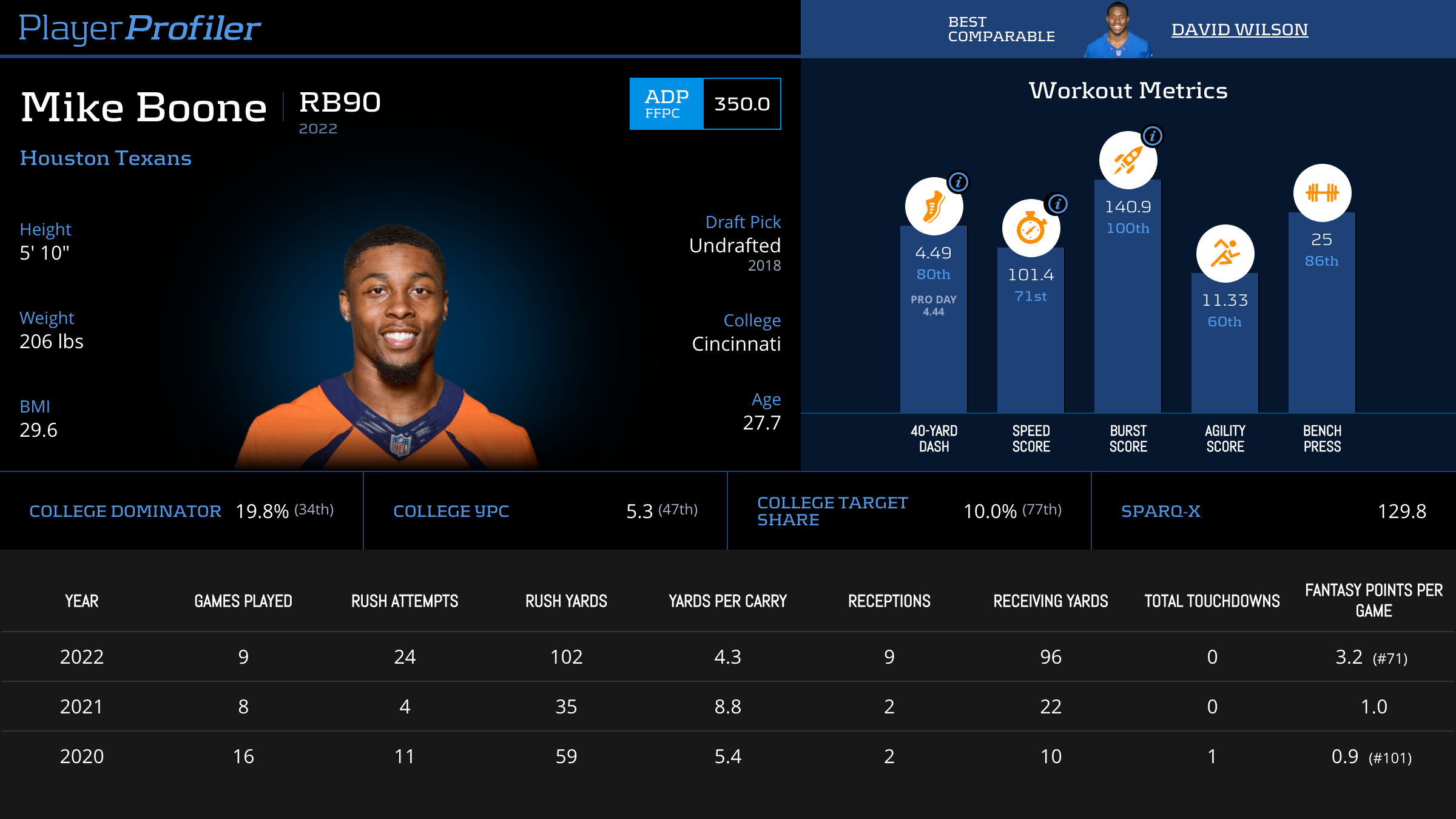 | Year Year | Games Games | Rush Attempts Rush Atts | Rushing Yards Rush Yrds | Total Touchdowns TDs | Receptions Rec | Receiving Yards Rec Yrds | Target Share Tgt Share | Age Age | School School |