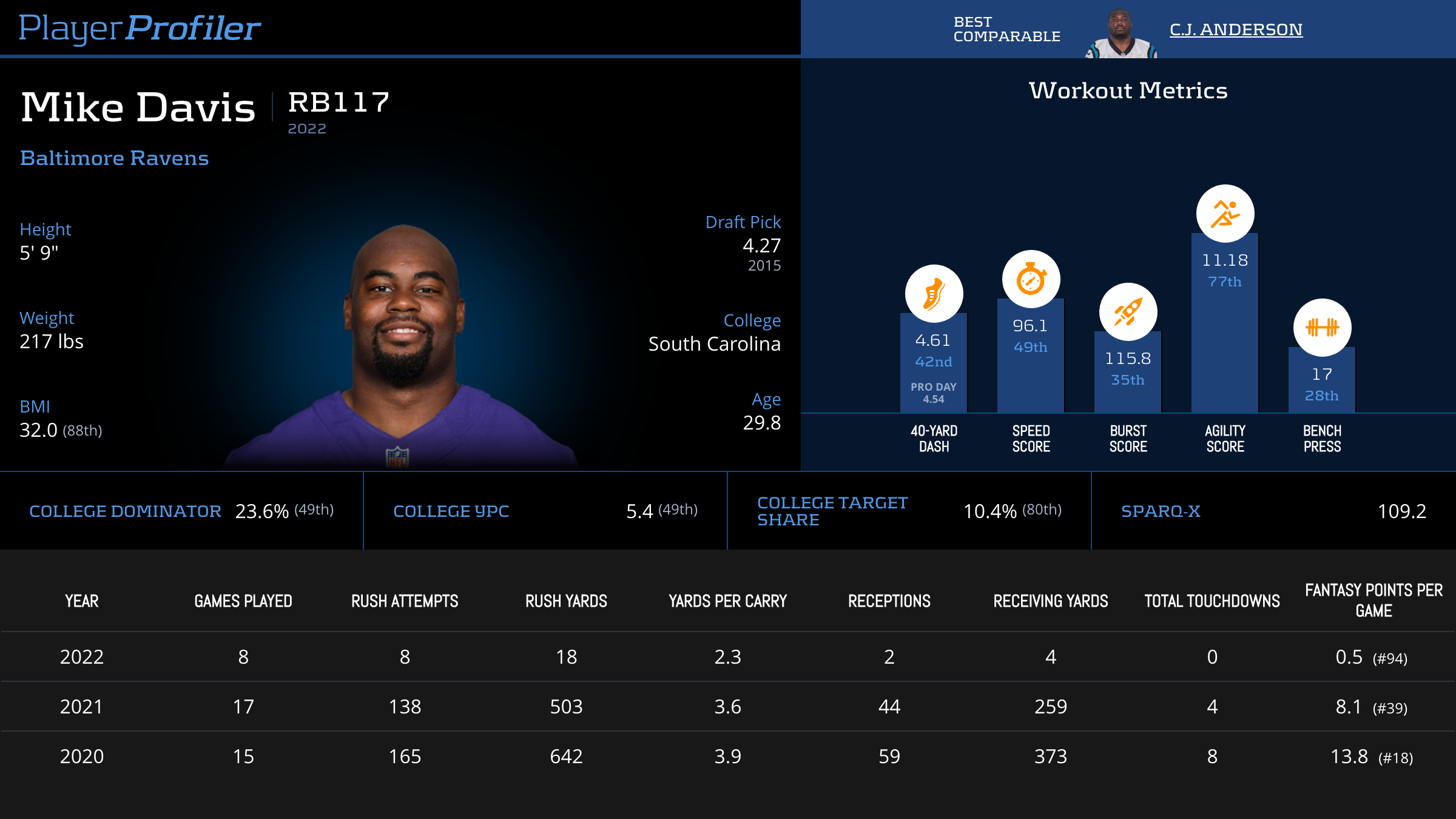 | Year Year | Games Games | Rush Attempts Rush Atts | Rushing Yards Rush Yrds | Total Touchdowns TDs | Receptions Rec | Receiving Yards Rec Yrds | Target Share Tgt Share | Age Age | School School |