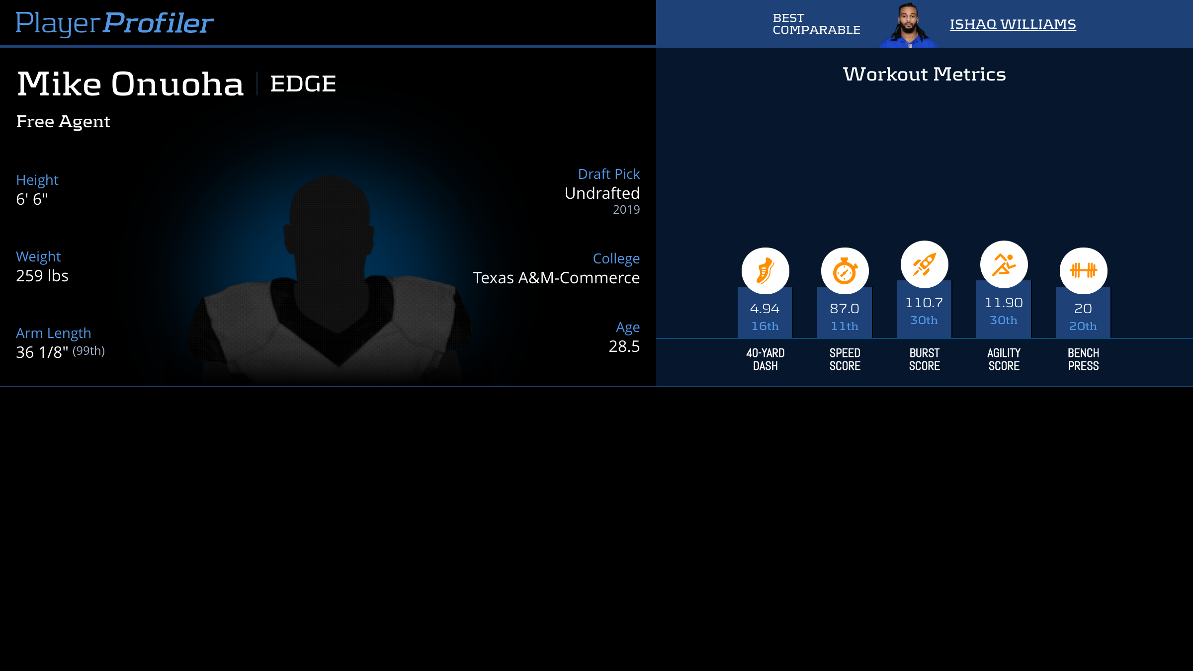 Download all Mike Onuoha advanced stats and metrics with Data Analysis.