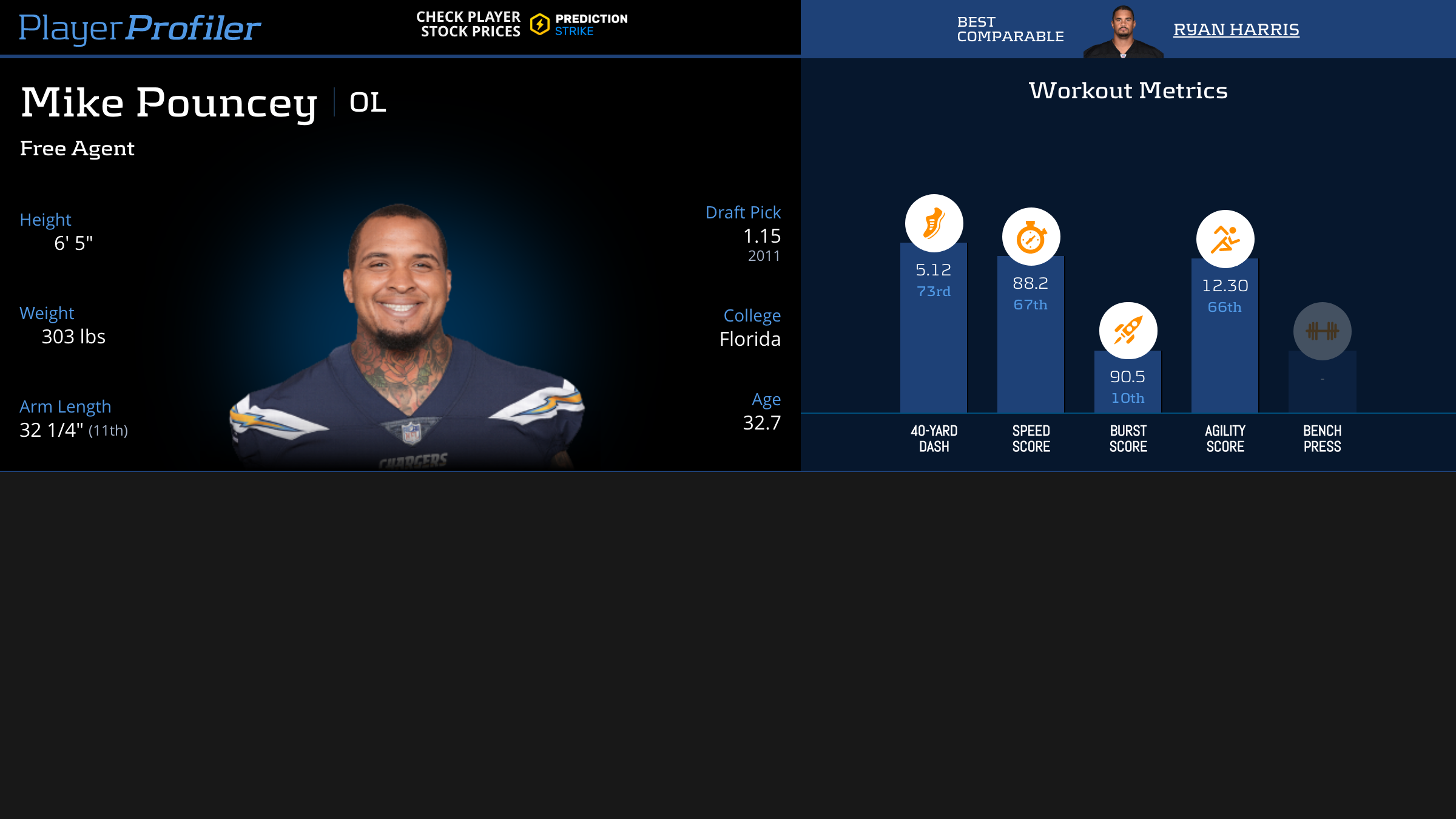 Download all Mike Pouncey advanced stats and metrics with Data Analysis.
