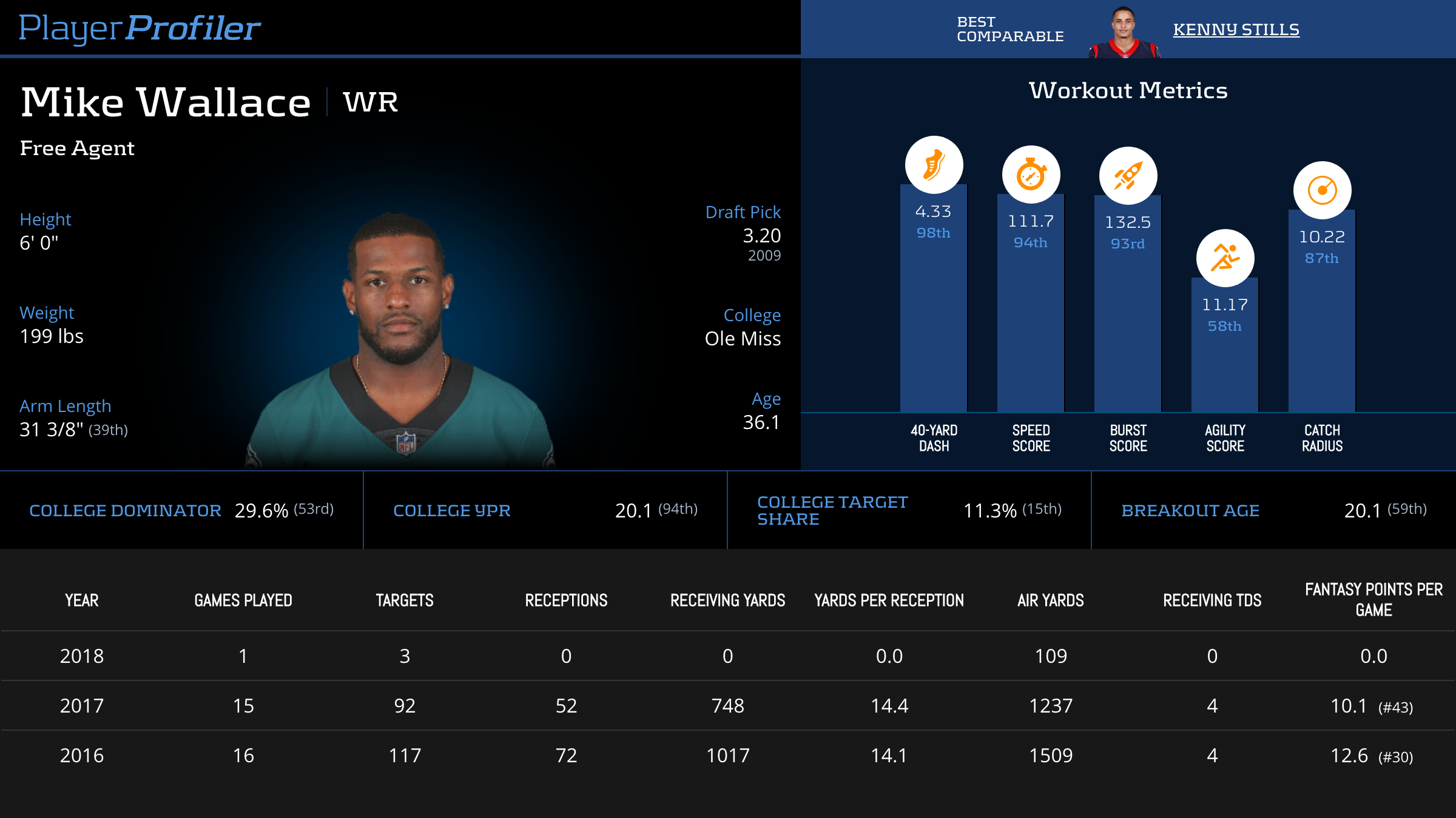 | Year Year | Games Games | Receptions Recs | Receiving Yards Rec Yds | Target Share Tgt Share | Catch Rate Catch Rate | Receiving Touchdowns Rec TDs | Special Teams Yards Special Teams | Age Age | School School |