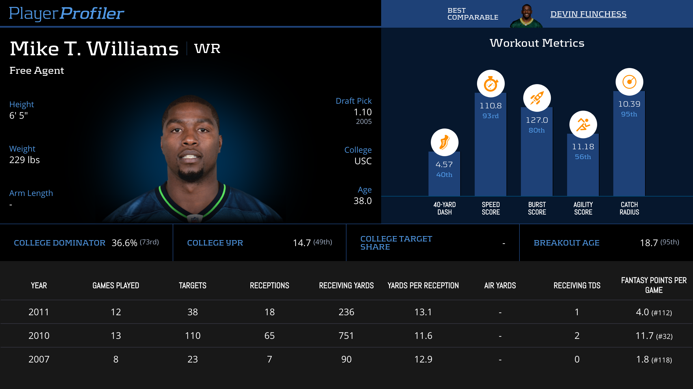 Year Games Tgts Rec Rec Yds YPR Air Yds Rec TD Fantasy Pts/Game