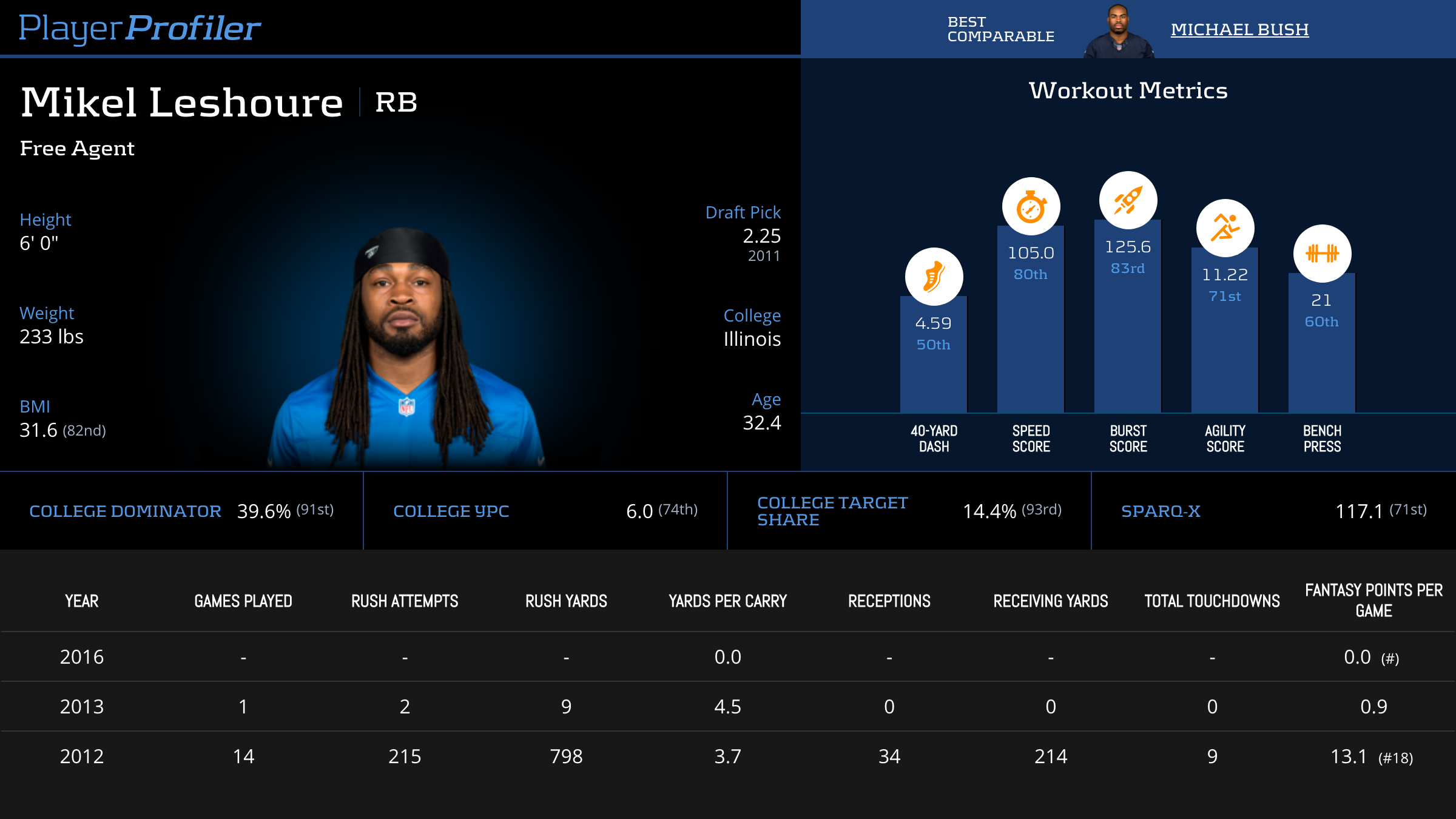 | Year Year | Games Games | Rush Attempts Rush Atts | Rushing Yards Rush Yrds | Total Touchdowns TDs | Receptions Rec | Receiving Yards Rec Yrds | Target Share Tgt Share | Age Age | School School |